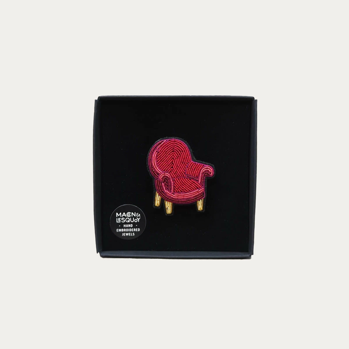Created by French designers Macon & Lesquoy, these fanciful brooches add color and cheer to any outfit. Each brooch is hand-embroidered in a workshop in Pakistan, using the “cannetille” technique on a felt background.