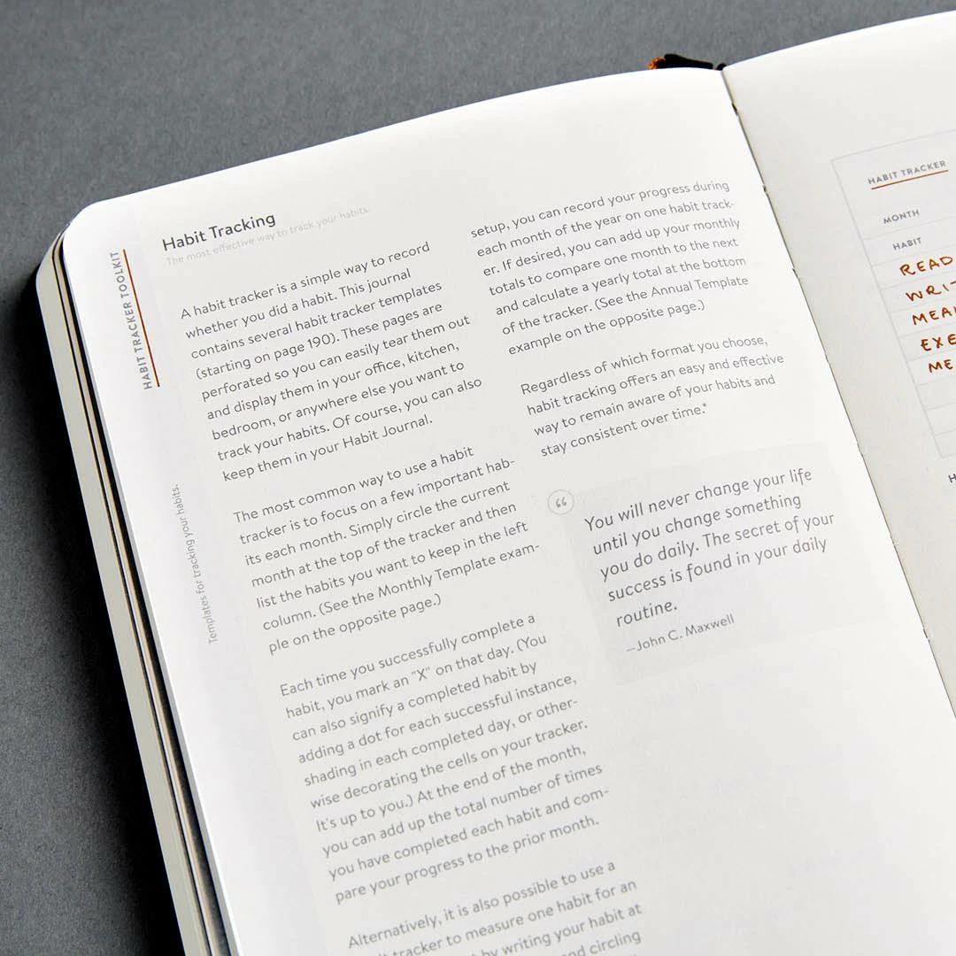 Baronfig’s Clear Habit journal is designed to help you track your habits, letting you see your daily systems clearly and make the small changes needed to have a big impact on your life. It includes dot grid pages with markings to help you divide up the pages to your liking, “One Line Per Day” pages to help you build a daily journaling habit, an index to log what you’ve written, and habit trackers to keep tabs on your daily habits, along with templates and examples to help you make the most of your journal. The journal features Baronfig’s signature cloth binding, an elastic closure, two cloth bookmarks, and sewn binding that opens flat.
