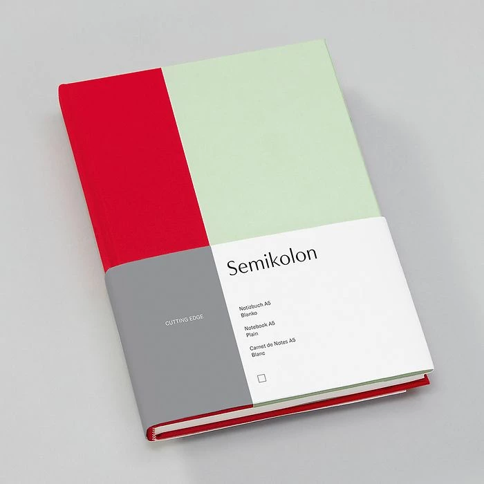 Semikolon’s Cutting Edge notebooks play boldly with color. Their two-tone colorblock design contrasts a bookcloth-covered spine and back cover with a splash of colored paper on the front cover. Inside, coordinating endpapers and a bookmark join the playful color scheme. It’s hard to resist collecting all the color combinations!
