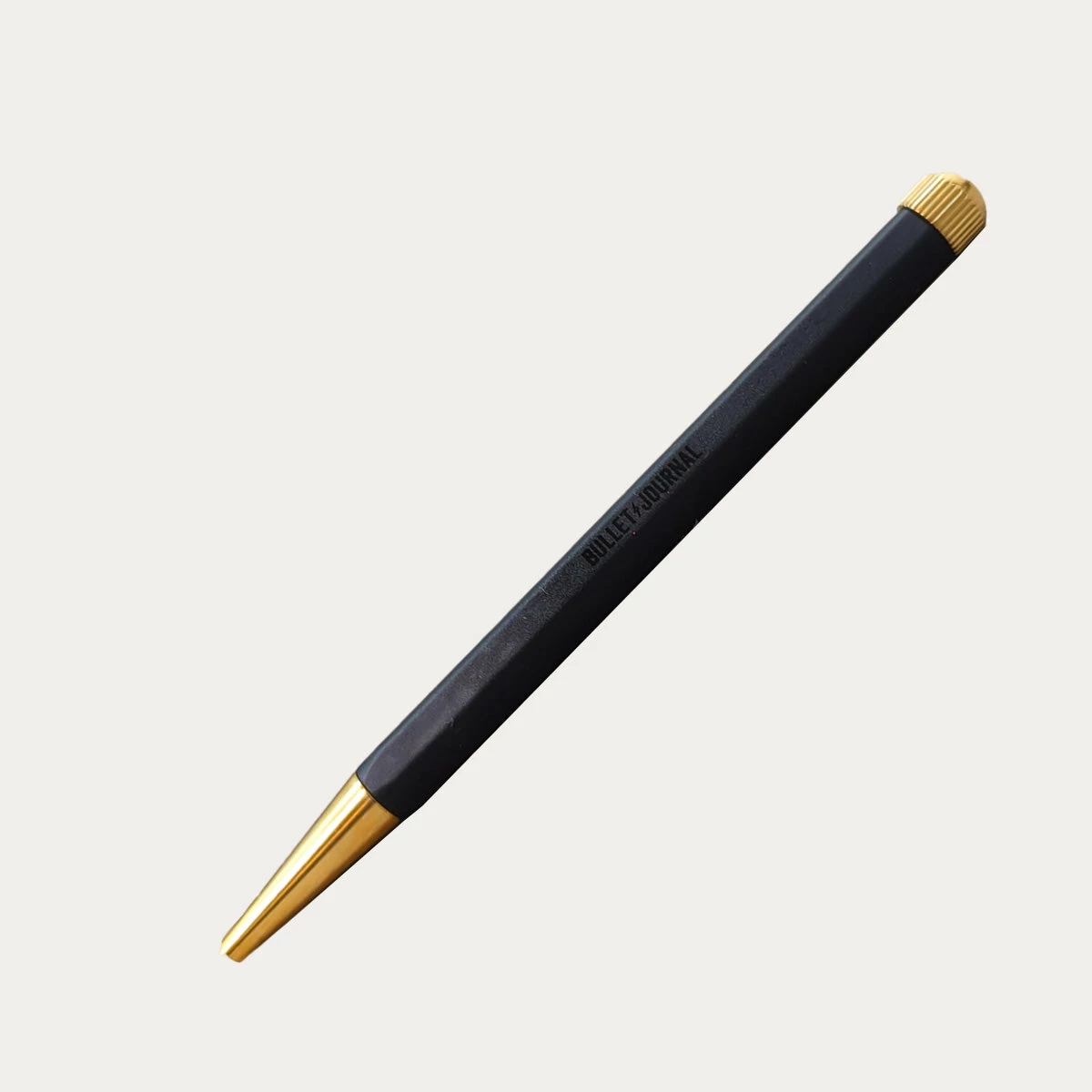 The original Bullet Journal is a collaboration between stationer Leuchtturm1917 and Bullet Journal method creator Ryder Carroll. The Bullet Journal version of the Drehgriffel pen was created to match the original Bullet Journal, with a black matte body, golden trimmings, and a glossy Bullet Journal logo printed subtly on the side.