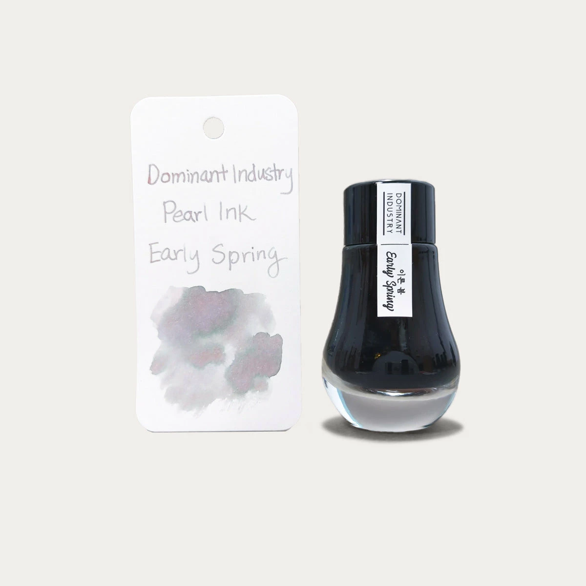 Korean Dominant Industry inks come in lightbulb-shaped glass bottles, reflecting the brand’s goal of capturing light in their ink colors. The ink inside is as great as the bottles are eye-catching. Early Spring is part of their Pearl Series of shimmering, pearlescent inks. It’s a soft pinkish-grey color with green tones and a pearly pink finish.