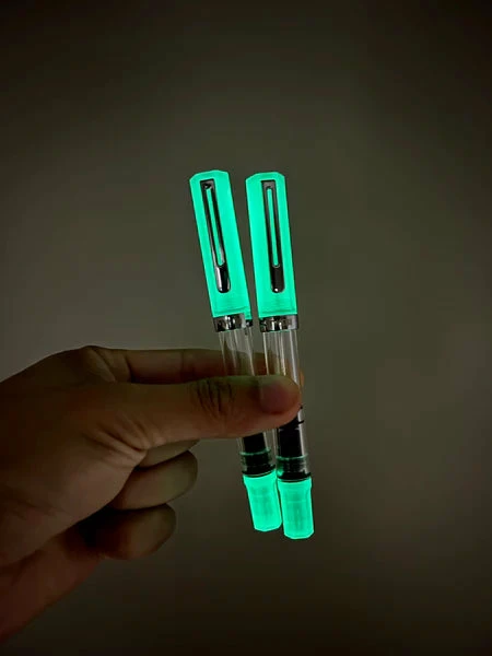 If you like to play with bottled inks (like me) and like to have fun with all the shimmering or shading inks (also me), I highly recommend getting the broad or 1.1 stub nib. It gives you the luxury of seeing your beautiful ink flowing inside like the galaxy and you can bring that same galaxy onto paper using this pen, writing smoothly to the last drop. Need more reasons to buy a pen? It GLOWS IN THE DARK.”