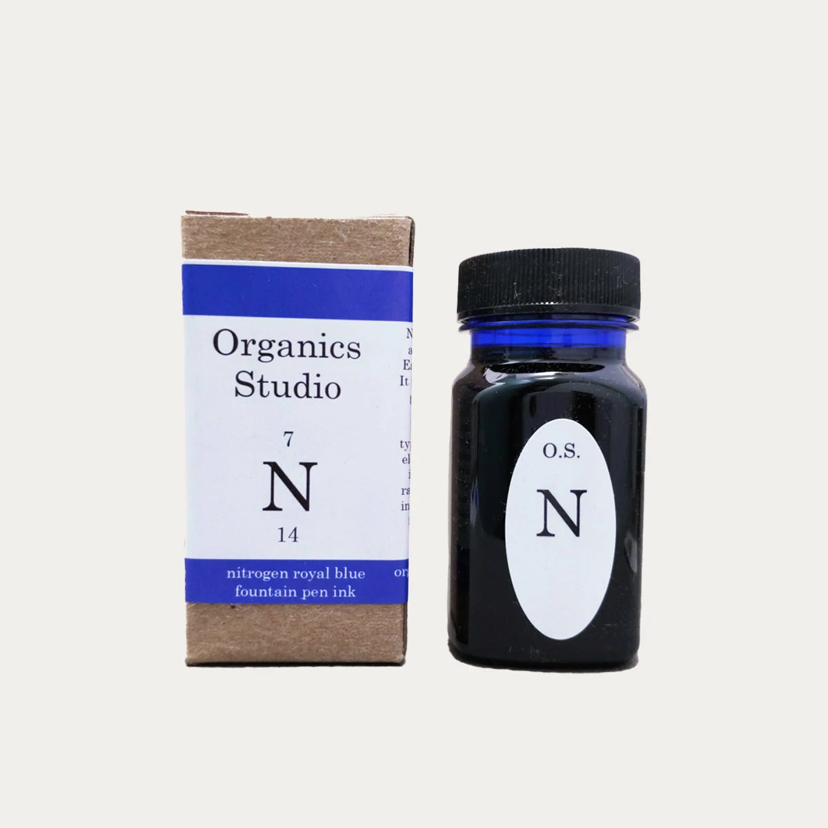 Organics Studio was founded in 2012 by a chemistry student and fountain pen enthusiast. Their chemistry-themed “Elements” series of inks is a collection of essential colors for an arsenal of inks. “Nitrogen Royal Blue” is a vivid bright blue with a high magenta sheen.