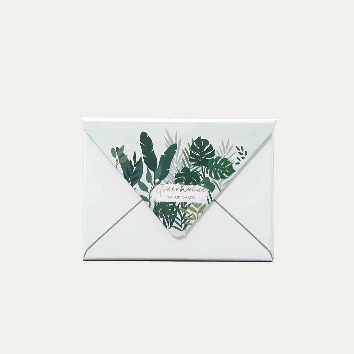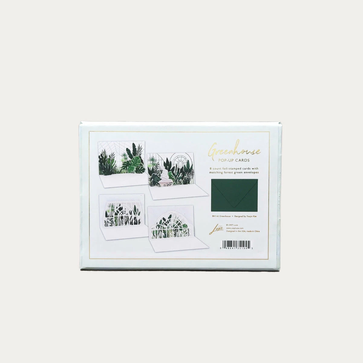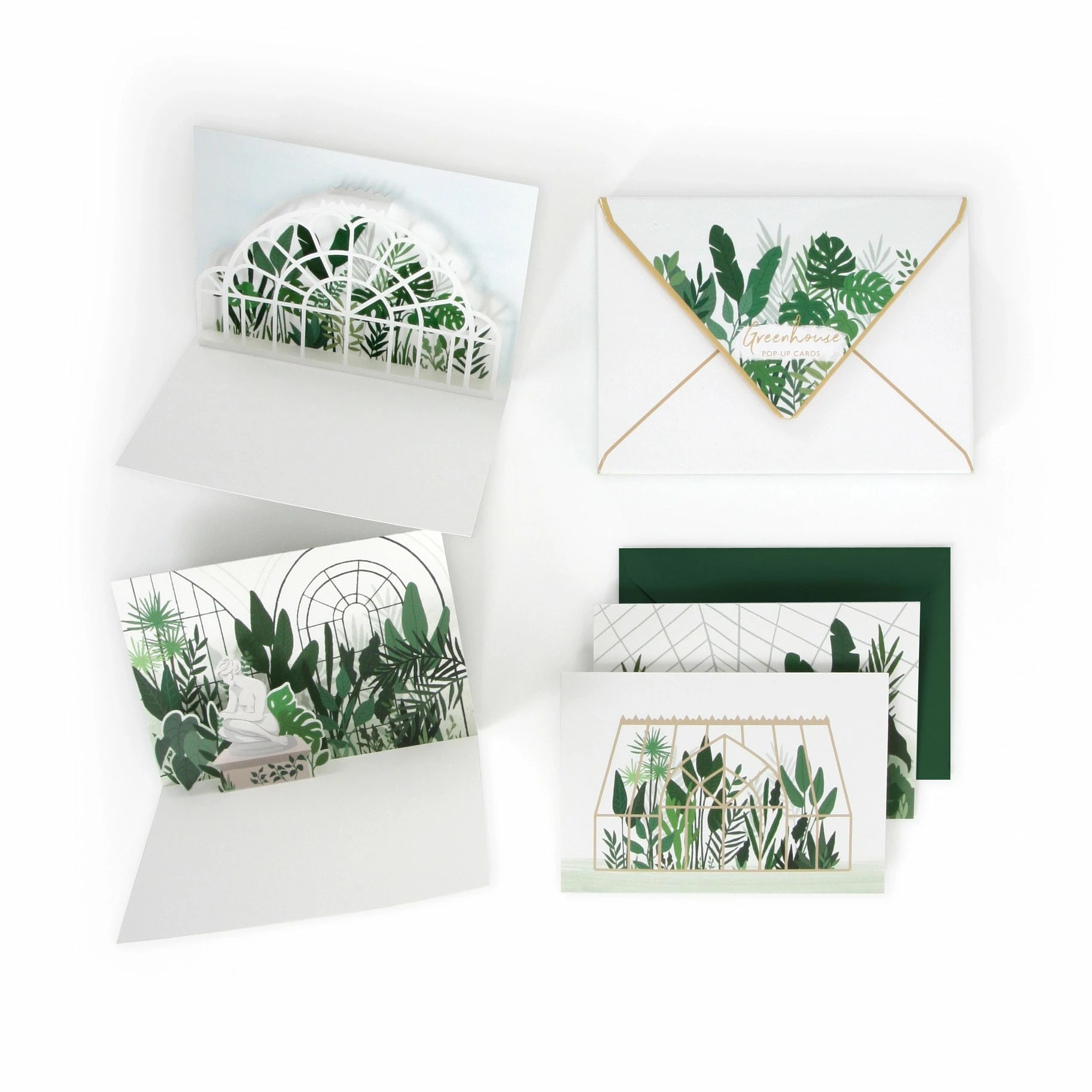 This set of gorgeous pop up notecards contains four styles of cards with greenhouse designs, featuring verdant flora and delicate architecture. They come in a sturdy and beautiful box with a magnetic closure