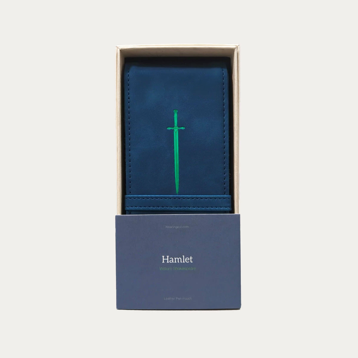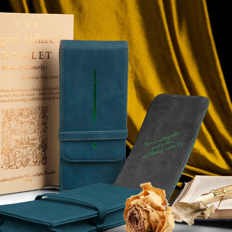The Hamlet pen case is a deep blue color with a grey lining. On the front is a green foil-stamped icon of a sword with a drop of poison, and silk-screened on the suede inside the cover flap is the phrase “There is nothing either good or bad, but thinking makes it so.“