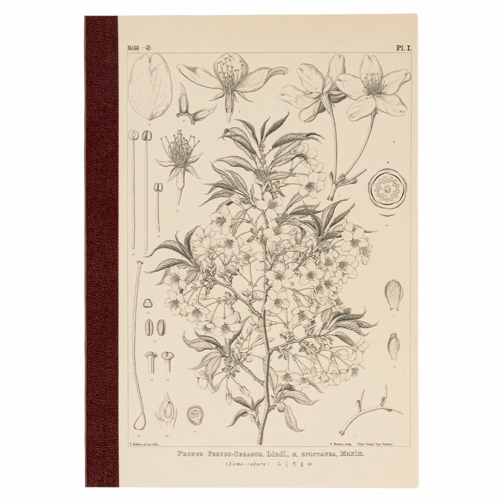 Use this notebook to add supplemental pages to your Hobonichi Techo, or just enjoy it as an everyday notebook. The front cover features a botanical drawing of a Yamazakura by Tomitaro Makino.