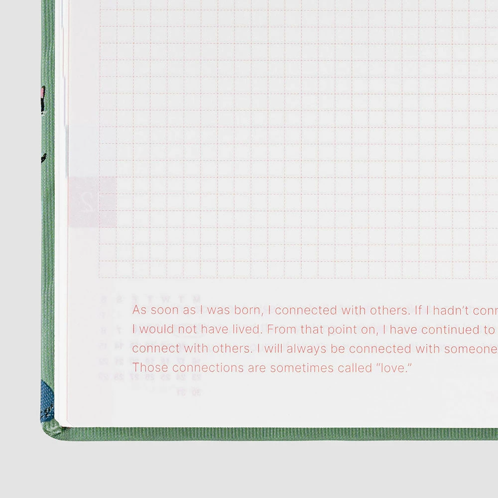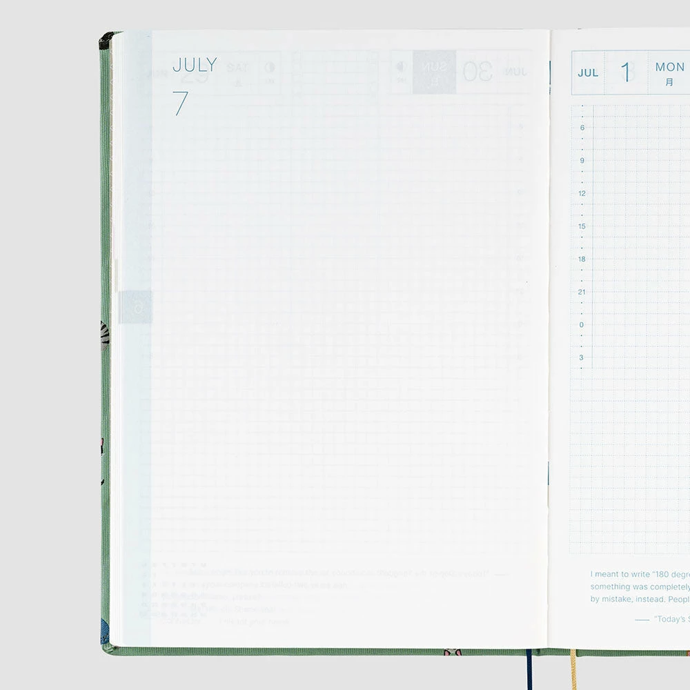The A5 Techo has a page-per-day layout. Each page is headed with the date, day of the week, phase of the moon, and a small fill-in checklist, and each footer has an inspirational quote and a mini monthly calendar for quick reference. The pages have a grid background which provides guidance if you want to divide the pages, draw boxes, create checklists, or write journal entries, but the grid is light enough to disregard. Along the left side of the page is a thin timeline column which can be used to create an hourly schedule. Each month is printed in a different color so it’s easy to distinguish between months, and Sundays are printed in red, so you always know when a new week begins.