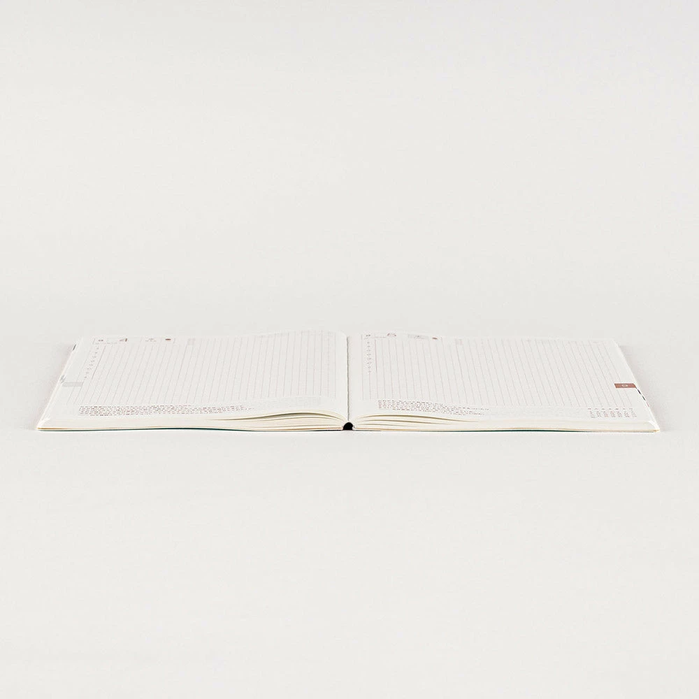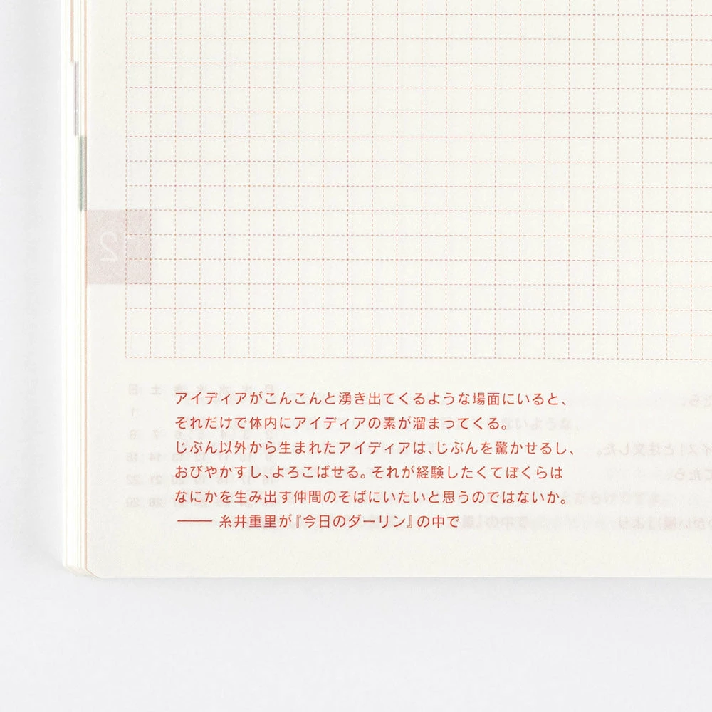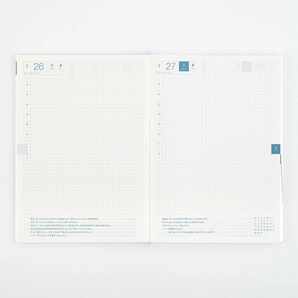 The A5 Techo has a page-per-day layout. Each page is headed with the date, day of the week, phase of the moon, and a small fill-in checklist, and each footer has an inspirational quote and a mini monthly calendar for quick reference. The pages have a grid background which provides guidance if you want to divide the pages, draw boxes, create checklists, or write journal entries, but the grid is light enough to disregard. Along the left side of the page is a thin timeline column which can be used to create an hourly schedule. Each month is printed in a different color so it’s easy to distinguish between months, and Sundays are printed in red, so you always know when a new week begins.