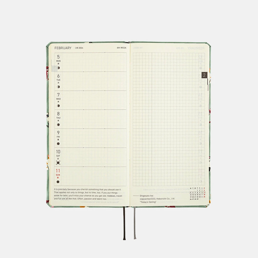 The Weeks Techo has a page-per-week layout. The left-hand page of each spread has sections for each day of the week, with the phase of the moon printed under each date. Small dots printed on the weekly sections serve as a guide if you want to divide your schedule into morning, afternoon, and night. The right-hand page has a grid background where you can write lists and notes for the week. The footer of each spread has an inspirational quote and a mini monthly calendar for quick reference.