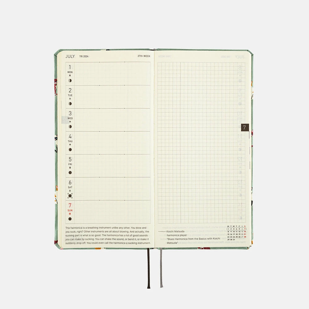 Slim and lightweight, the Weeks is made with thin but high quality Tomoe River paper. It has sturdy covers and comes with a clear pocket you can stick on to the inside of the cover, as well as two ribbon bookmarks you can use to keep your place.