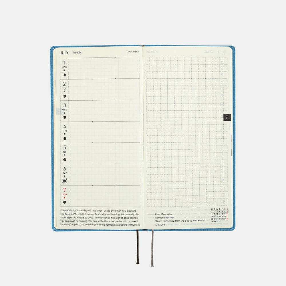 The Weeks Techo has a page-per-week layout. The left-hand page of each spread has sections for each day of the week, with the phase of the moon printed under each date. Small dots printed on the weekly sections serve as a guide if you want to divide your schedule into morning, afternoon, and night. The right-hand page has a grid background where you can write lists and notes for the week. The footer of each spread has an inspirational quote and a mini monthly calendar for quick reference.