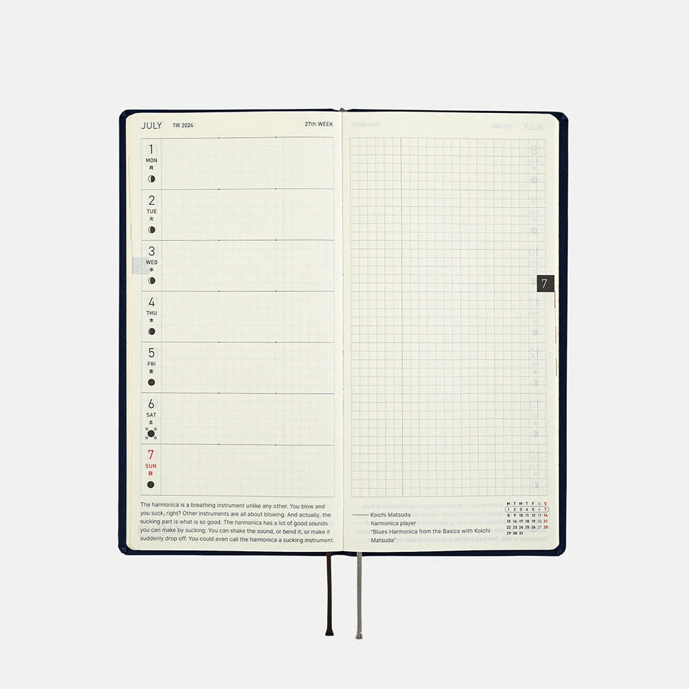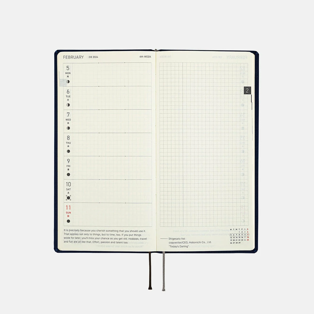 The Weeks Techo has a page-per-week layout. The left-hand page of each spread has sections for each day of the week, with the phase of the moon printed under each date. Small dots printed on the weekly sections serve as a guide if you want to divide your schedule into morning, afternoon, and night. The right-hand page has a grid background where you can write lists and notes for the week. The footer of each spread has an inspirational quote and a mini monthly calendar for quick reference.