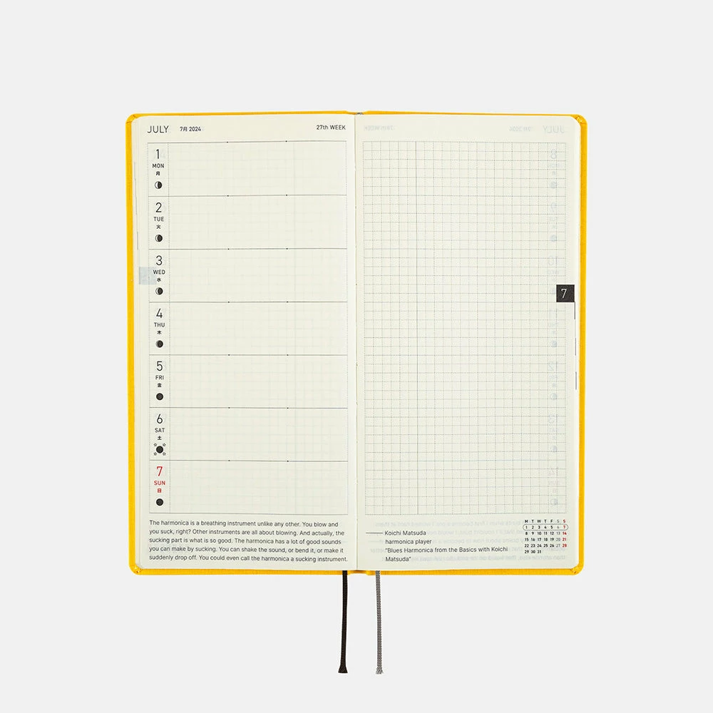 The Weeks Techo has a page-per-week layout. The left-hand page of each spread has sections for each day of the week, with the phase of the moon printed under each date. Small dots printed on the weekly sections serve as a guide if you want to divide your schedule into morning, afternoon, and night. The right-hand page has a grid background where you can write lists and notes for the week. The footer of each spread has an inspirational quote and a mini monthly calendar for quick reference.