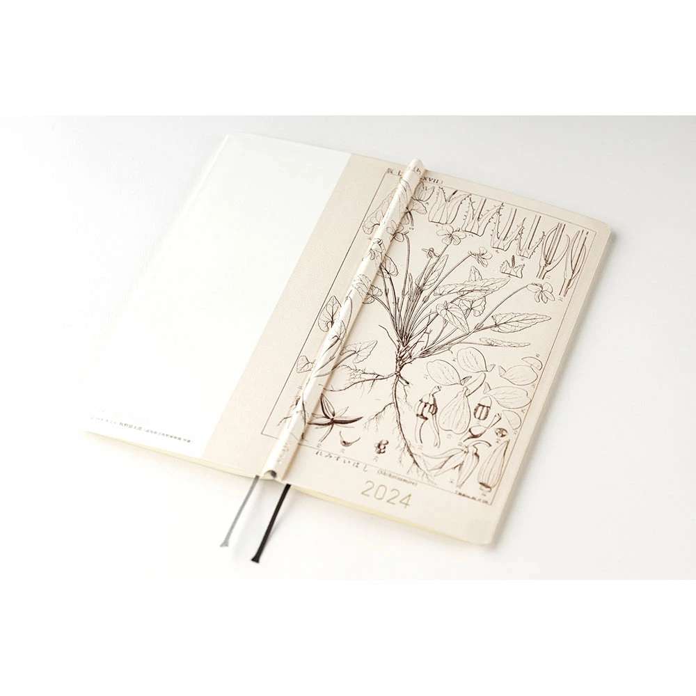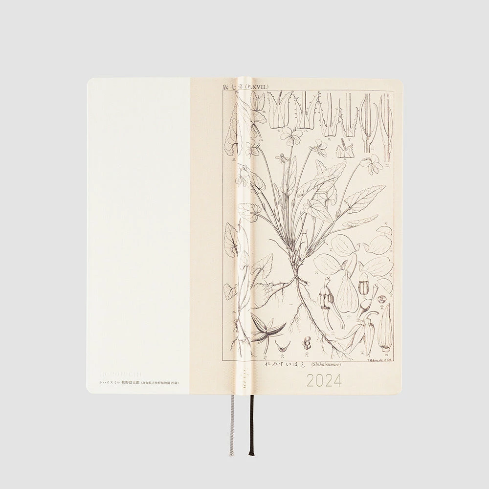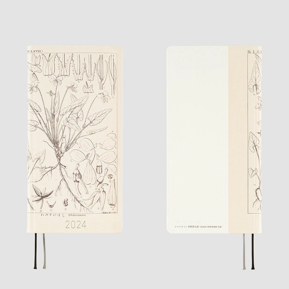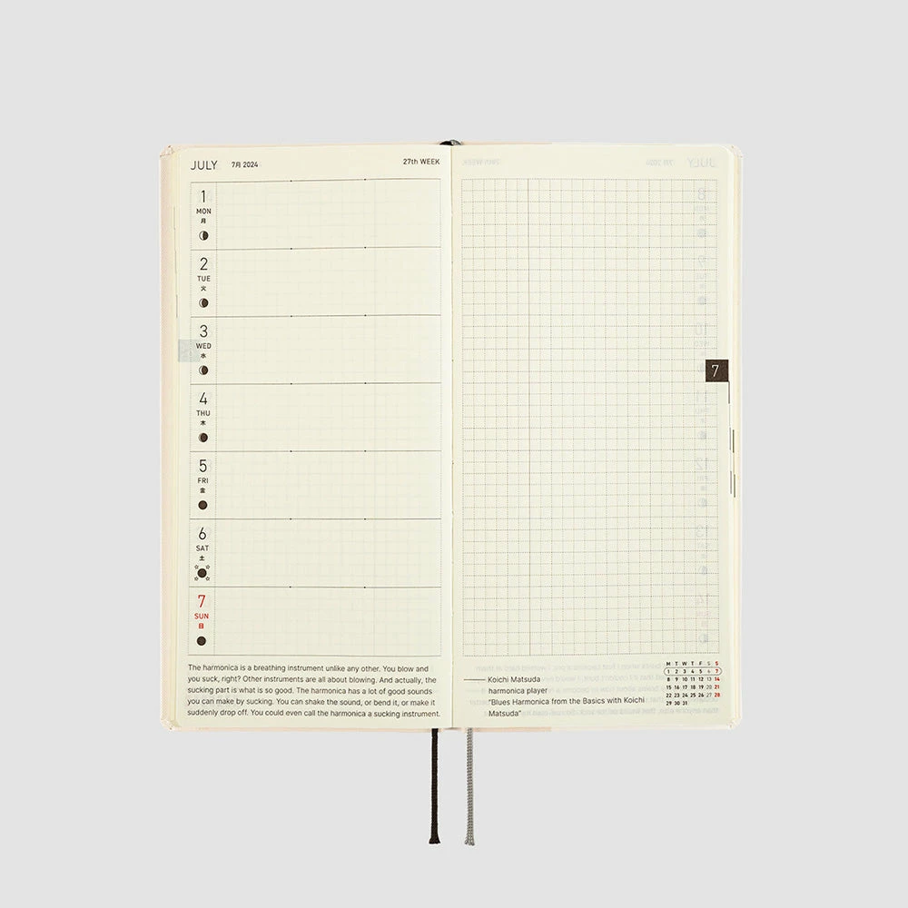 Slim and lightweight, the Weeks is made with thin but high quality Tomoe River paper. It has sturdy covers and comes with a clear pocket you can stick on to the inside of the cover, as well as two ribbon bookmarks you can use to keep your place.