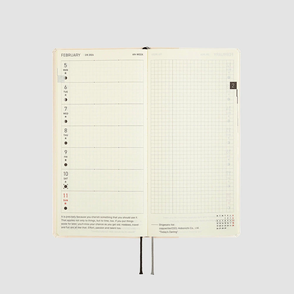 The Weeks Techo has a page-per-week layout. The left-hand page of each spread has sections for each day of the week, with the phase of the moon printed under each date. Small dots printed on the weekly sections serve as a guide if you want to divide your schedule into morning, afternoon, and night. The right-hand page has a grid background where you can write lists and notes for the week. The footer of each spread has an inspirational quote and a mini monthly calendar for quick reference.