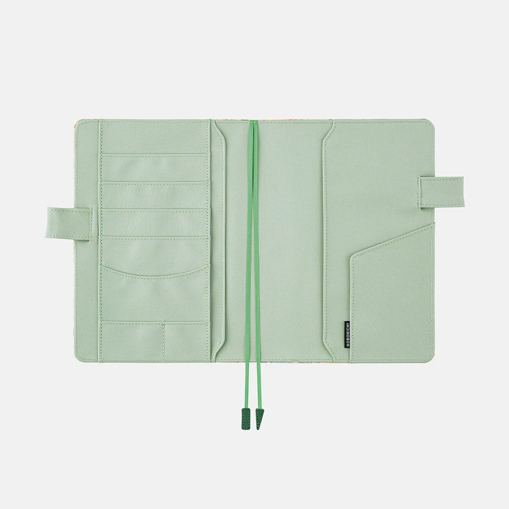 Carry your Hobonichi Cousin planner in this handy cover, which can double as a wallet or case for all your daily necessities. It has pockets to slide in the covers of your Cousin planner, plus lots of card pockets for credit cards, business cards, or small stationery items. It has two bookmarks to help you keep your place, and the cover has two pen loops that serve to keep it closed when a pen is inserted.