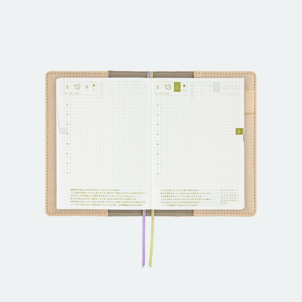The Hobonichi Techo is a popular Japanese planner packed with thoughtfully designed details that make it a beloved organization tool and an open-ended format that doesn’t box users in. It’s popularly used as a planner, bullet journal, diary, and sketchbook, among other uses. This version is the original A6 size Hobonichi Techo, a compact book that’s easy to carry with you everywhere.