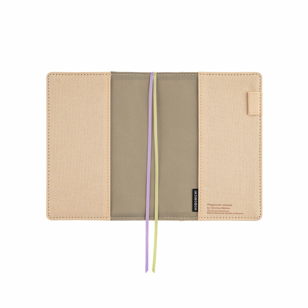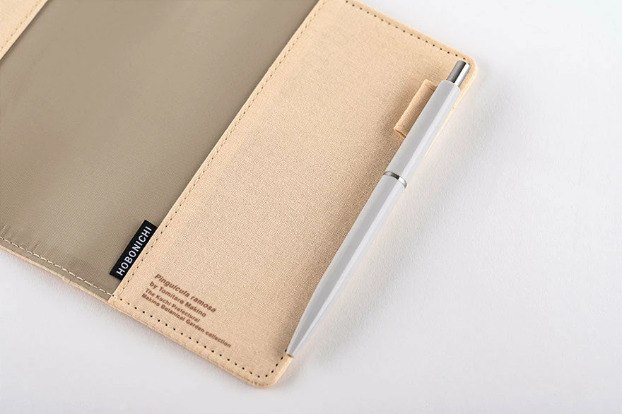 This cover features prints of botanical drawing of a Koshinso by Tomitaro Makino on a cotton material. There’s a secret message – a word by Makino translated into English – inside the outer back pocket. The cover includes two pen loops that keep it closed when a pen is inserted. It has two bookmarks to help you keep your place and a plethora of pockets to hold credit cards, business cards, stamps, tickets, sticky notes, and other odds and ends.