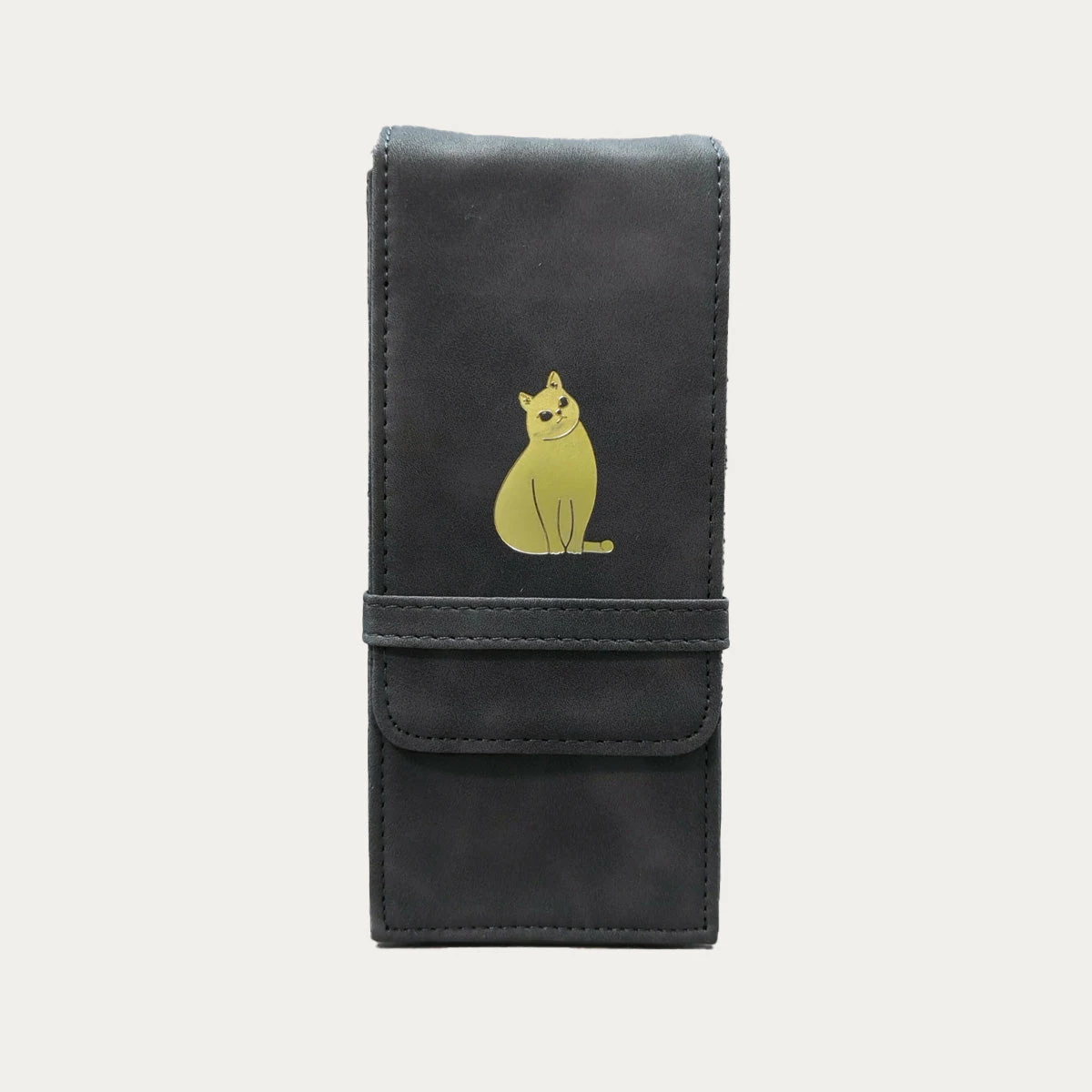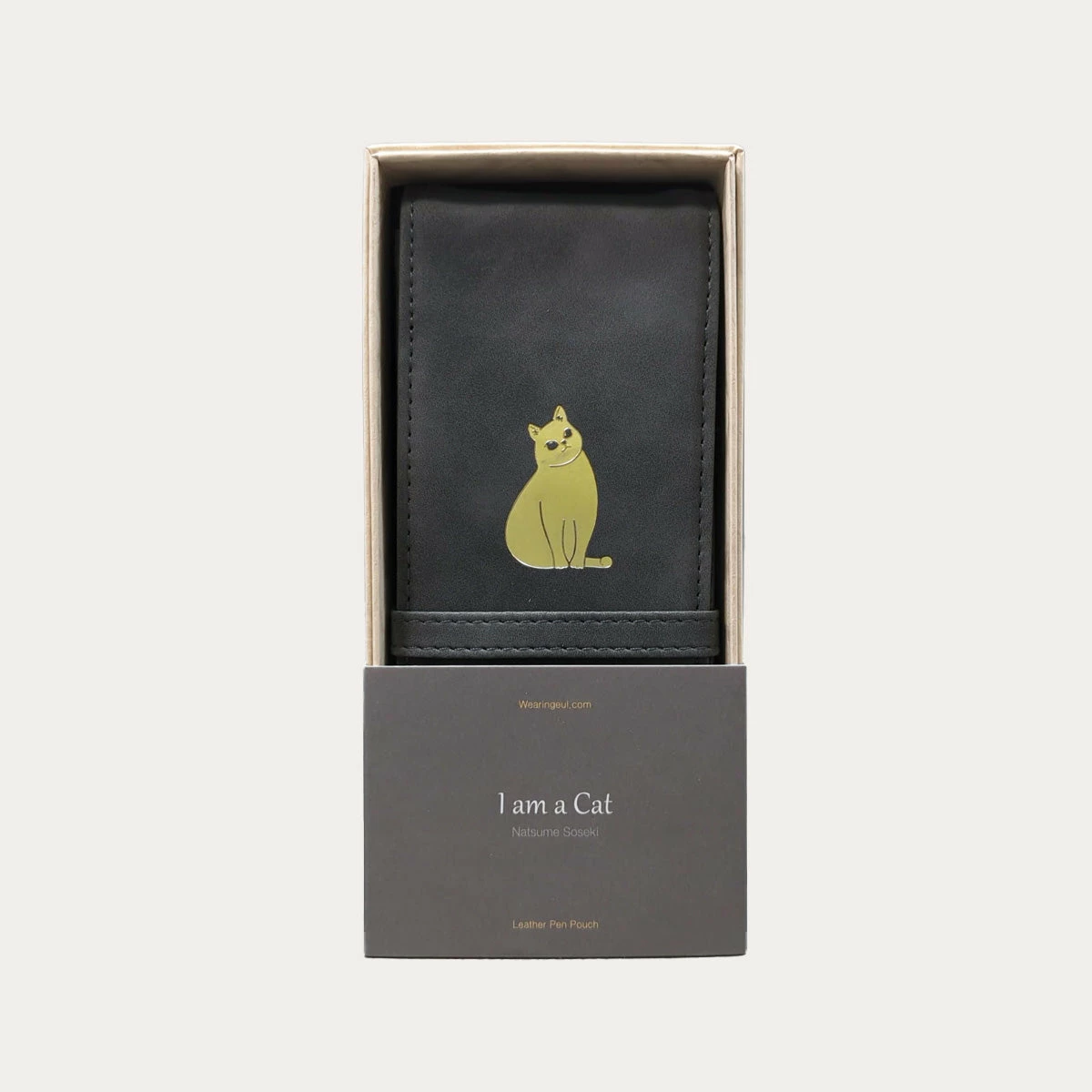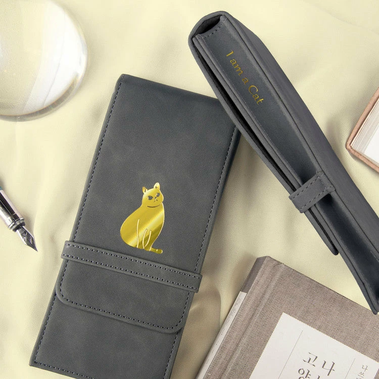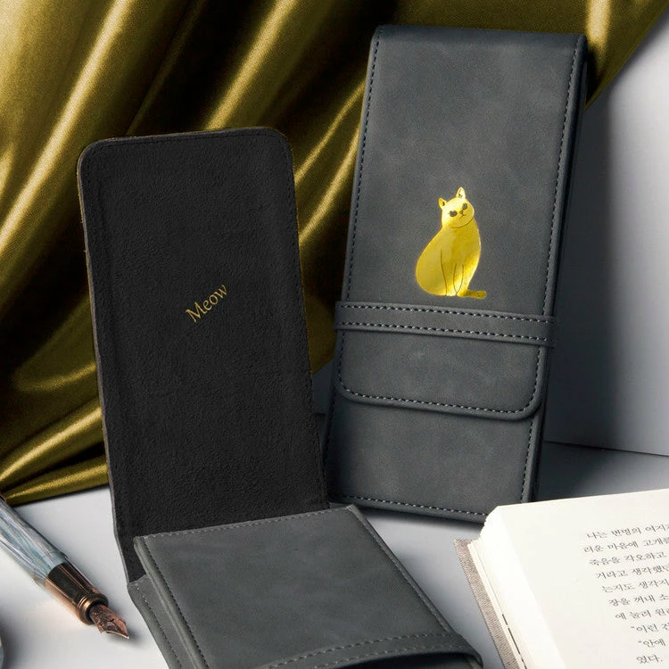 The I Am a Cat pen case is a charcoal grey color with a black lining. On the front is a gold foil-stamped icon of a cat, and the word “Meow” is silk-screened on the suede inside the cover flap.