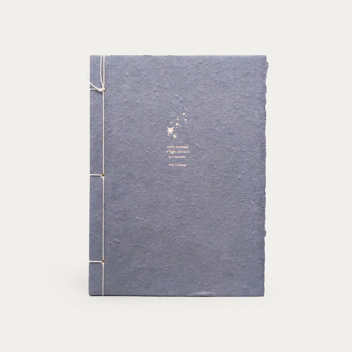 This hand bound journal by Oblation Papers and Press has a handmade, deckle-edged cover, letterpress printed with an inspirational quote from Walt Whitman: “Every moment of light and dark is a miracle.”