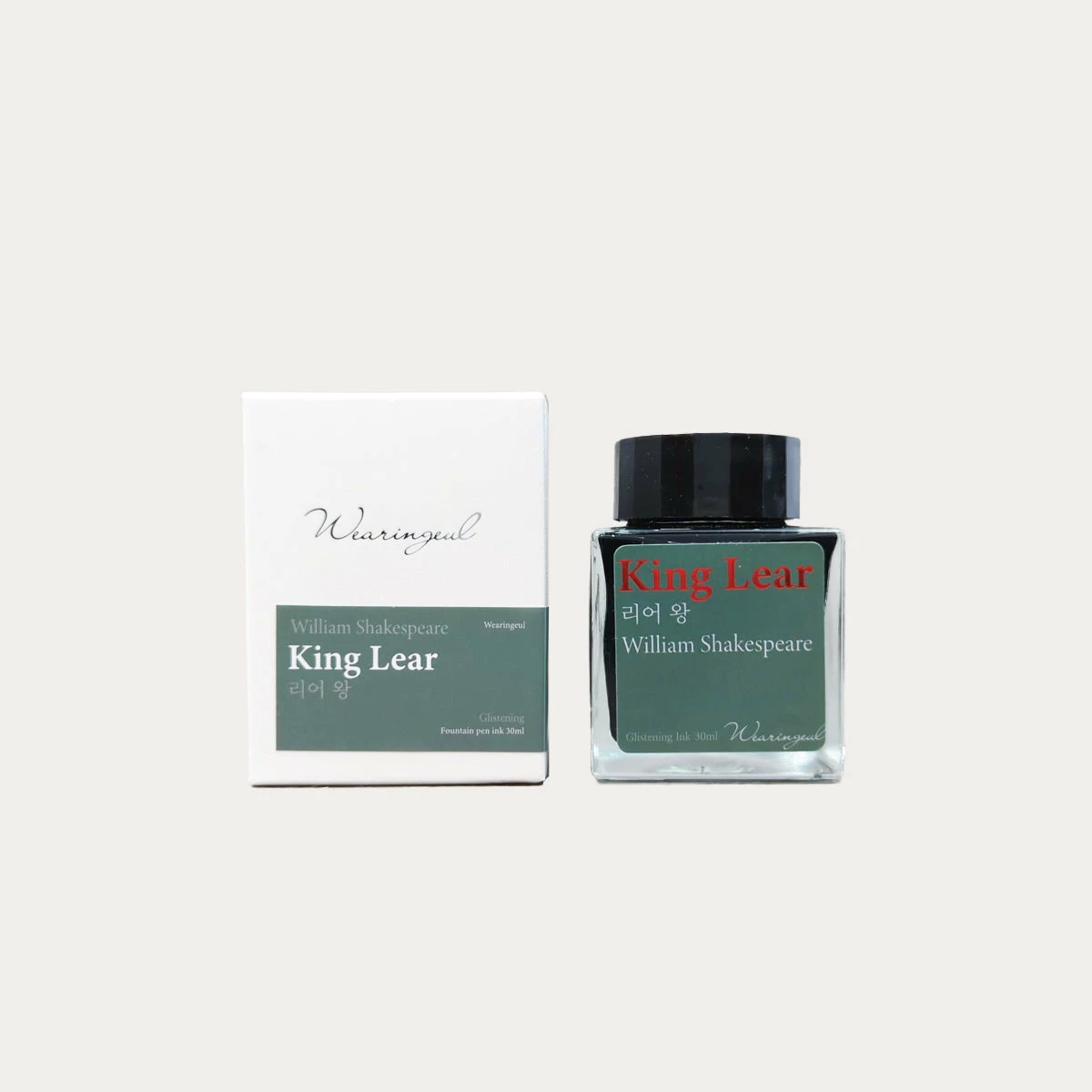 Their King Lear ink is based on the play by William Shakespeare. They describe it as the color of the tragic king’s madness: a mournful red glitter on a shading greenish-gray base.