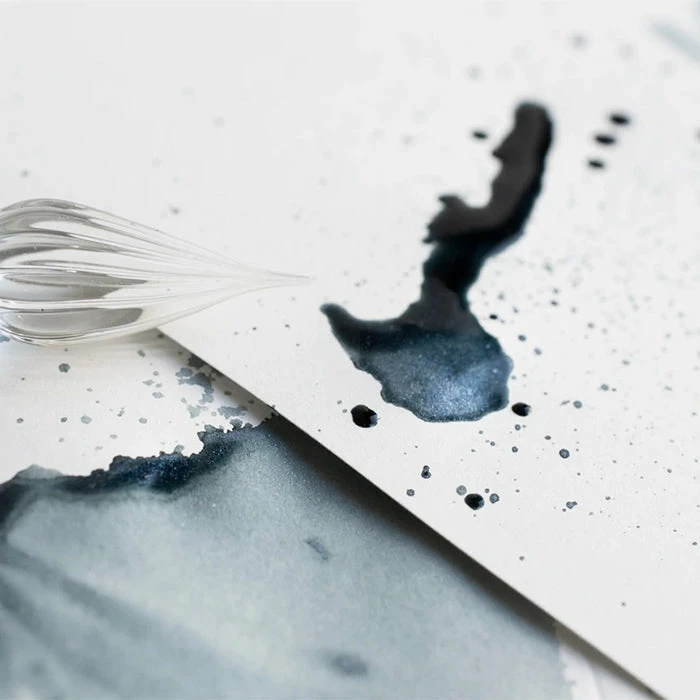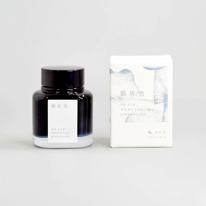 Kyo No Oto inks are made in Kyoto, Japan. Made in small batches, their rich, complex colors are inspired by the city’s scenery and culture. “Ginkaisyoku” is a blue gray color with silver shimmer.