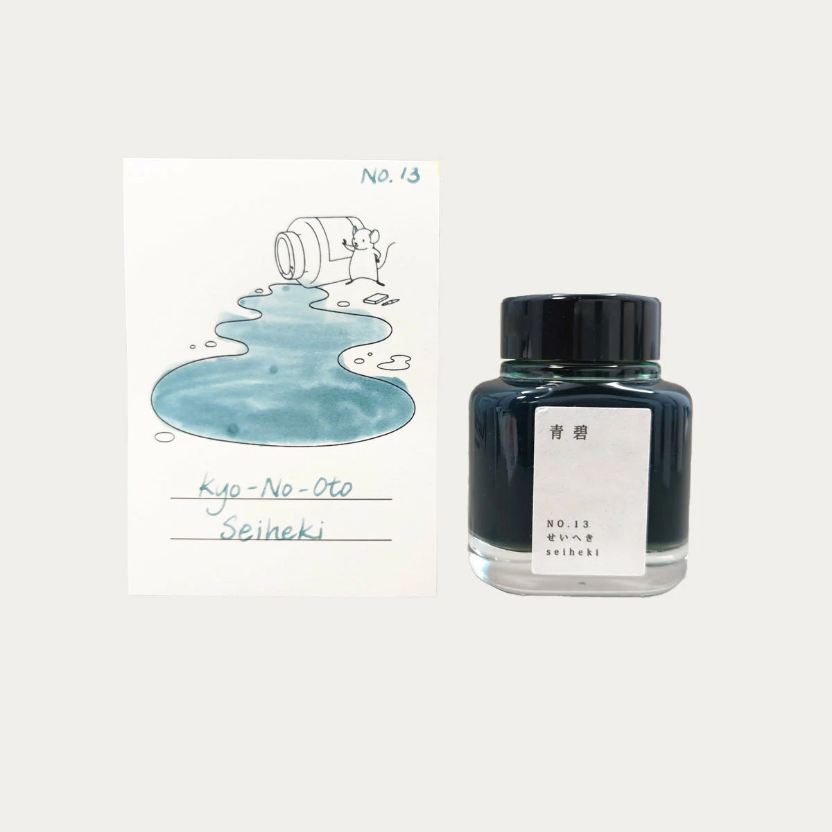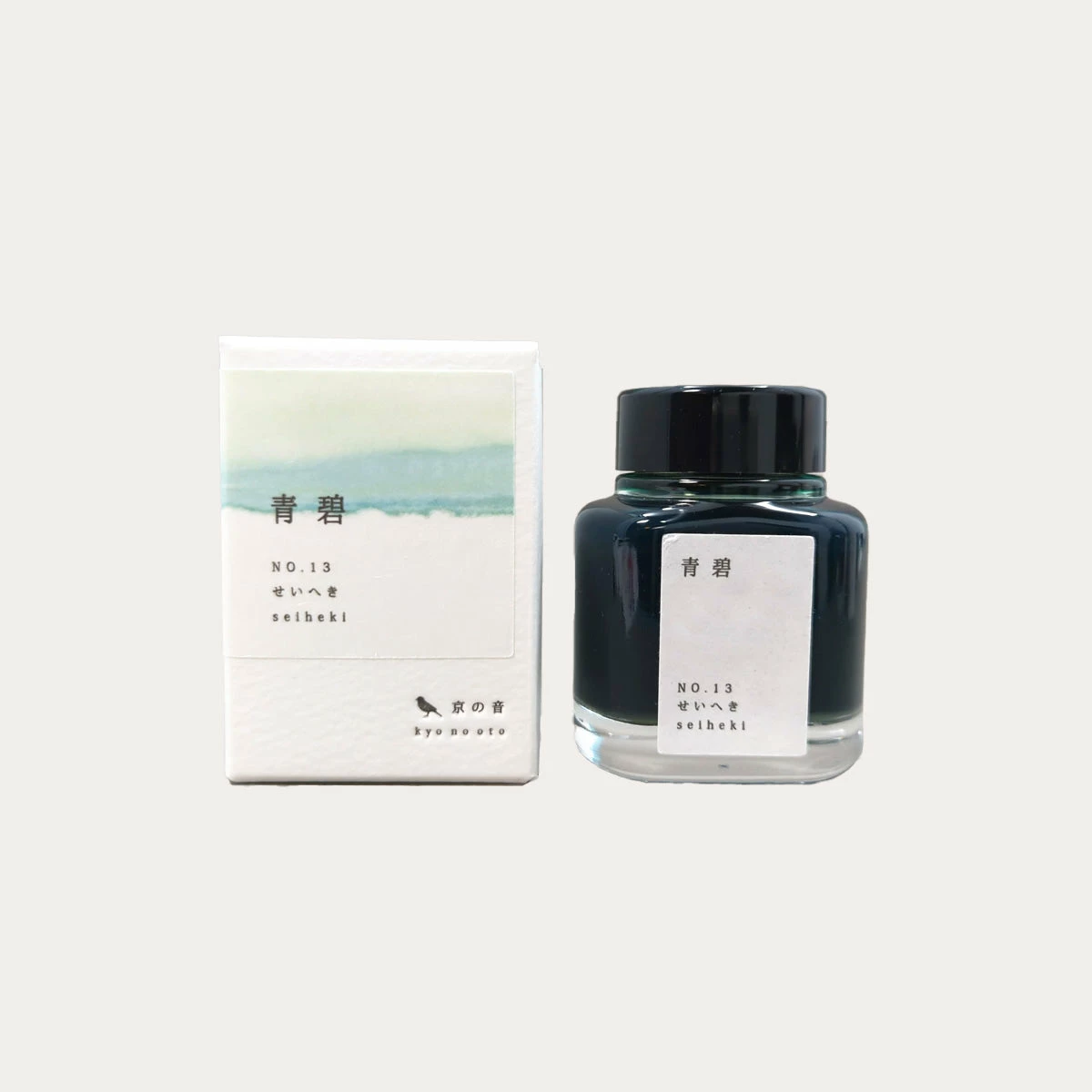Kyo No Oto inks are made in Kyoto, Japan. Made in small batches, their rich, complex colors are inspired by the city’s scenery and culture. “Seiheki” is a soft, changeable blue-green inspired by the color of the sky in daytime.