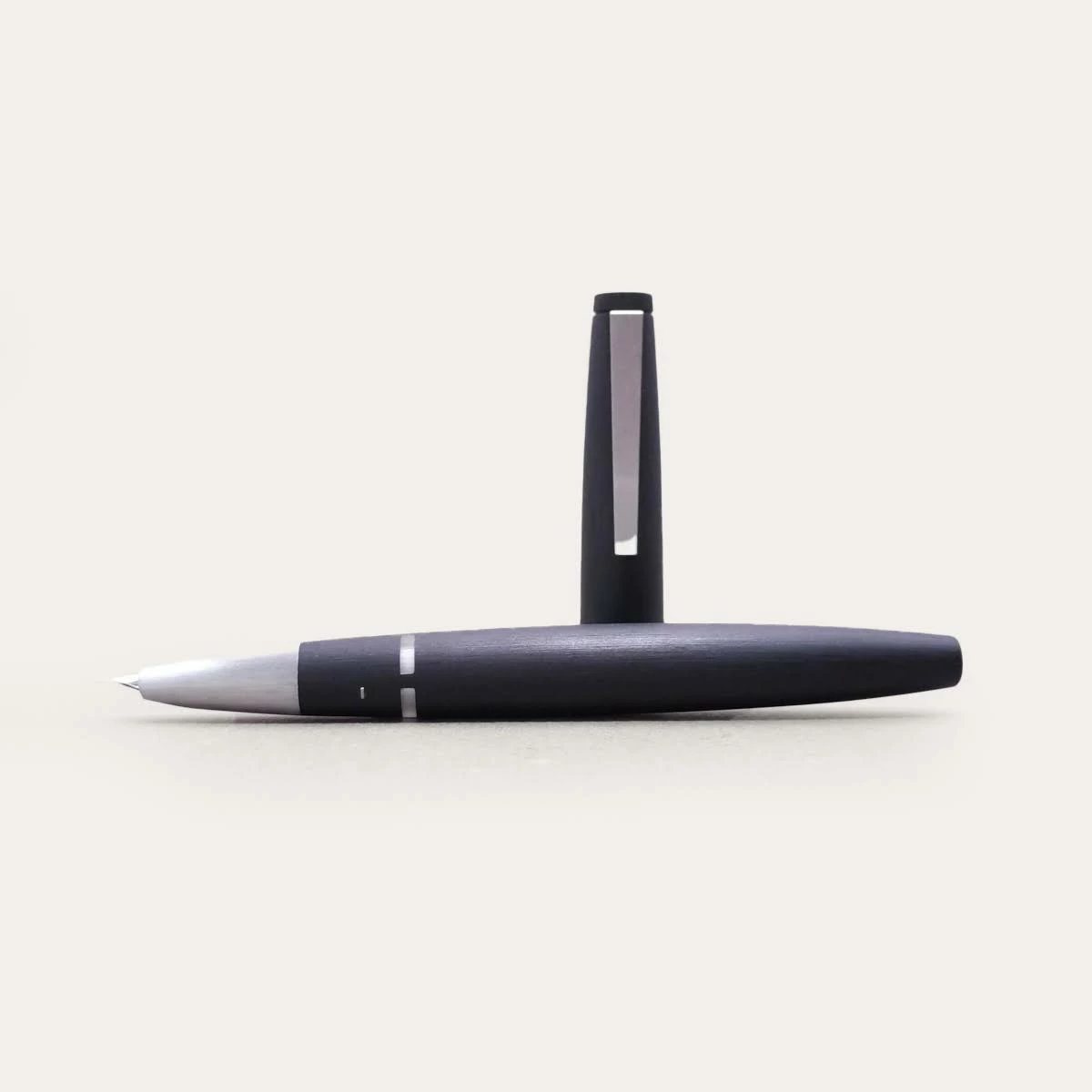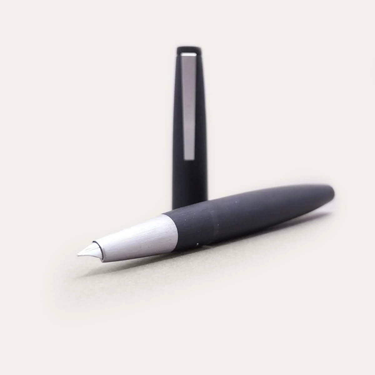 The 2000 is LAMY’s flagship fountain pen, first produced in 1966. This sleek, lightweight pen has a matte black fiberglass body and brushed stainless steel accents, with small windows on the barrel so you can keep an eye on your ink levels. It has a fine 14-carat gold nib that provides a smooth and comfortable writing experience, coated with platinum to match the pen body. A snap-on cap with a metal clip completes the pen. This pen has a built-in converter with a large capacity and takes bottled inks only.