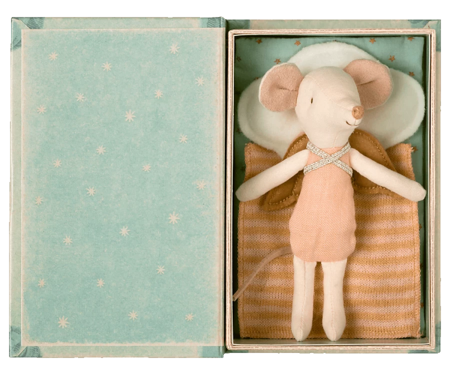 This Guardian Angel mouse will watch over you wherever you go. The angel mouse comes inside of a book-shaped box, with a cozy blanket inside and a cloud for a pillow. Your guardian angel can also wear the cloud along with sparkly gold wings to float along in the heavens.