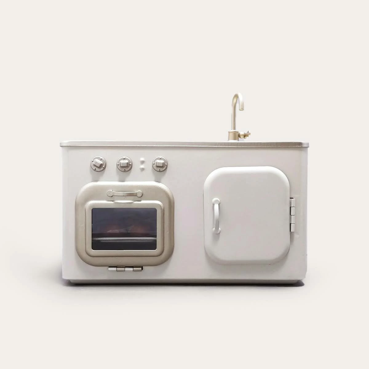Cook an imaginative dinner with your mouse friends in this adorable retro kitchen. The kitchen comes with a ladle, spatula, slotted spoon, pot, pan, kettle, and colander. It includes a removable metal wall with shelves and a rack for hanging the kitchen utensils.