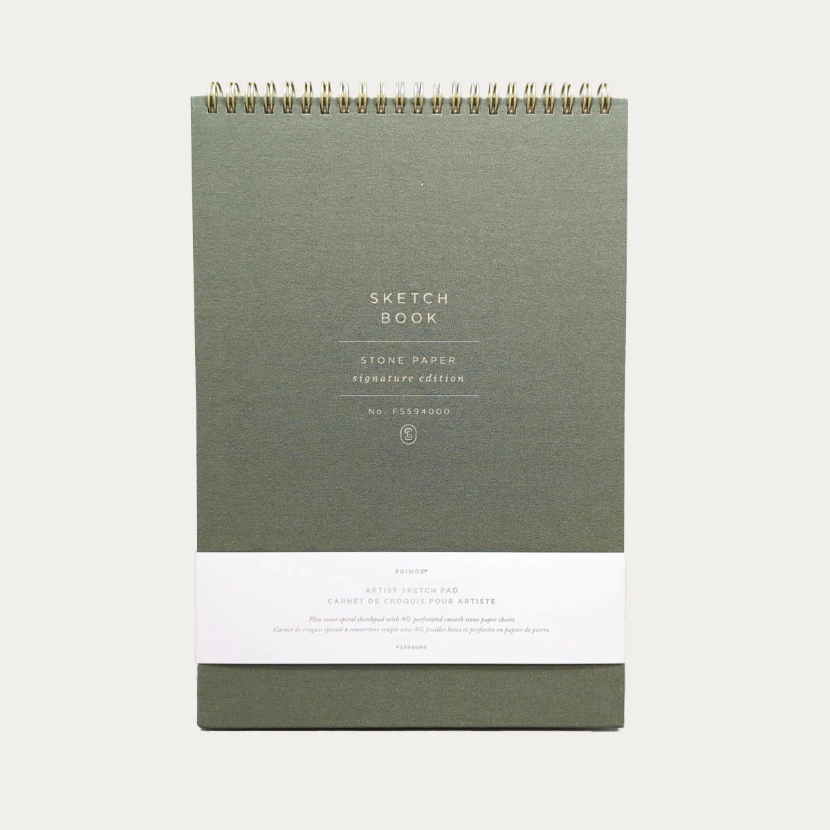 This lovely sketchbook features smooth paper made of stone that’s water- and tear-resistant. The flexible hard covers are bound with olive green cloth with gold debossing on the front. The spiral binding lets you fold the front cover under the sketchbook to create a firm surface for drawing on, making this a great sketchbook for drawing on the go or at a desk. The paper can be used for drawing with pencil, pen, marker, and watercolor (but note that dry times for wet media may vary on the water-resistant paper). The pages are perforated for easy removal.