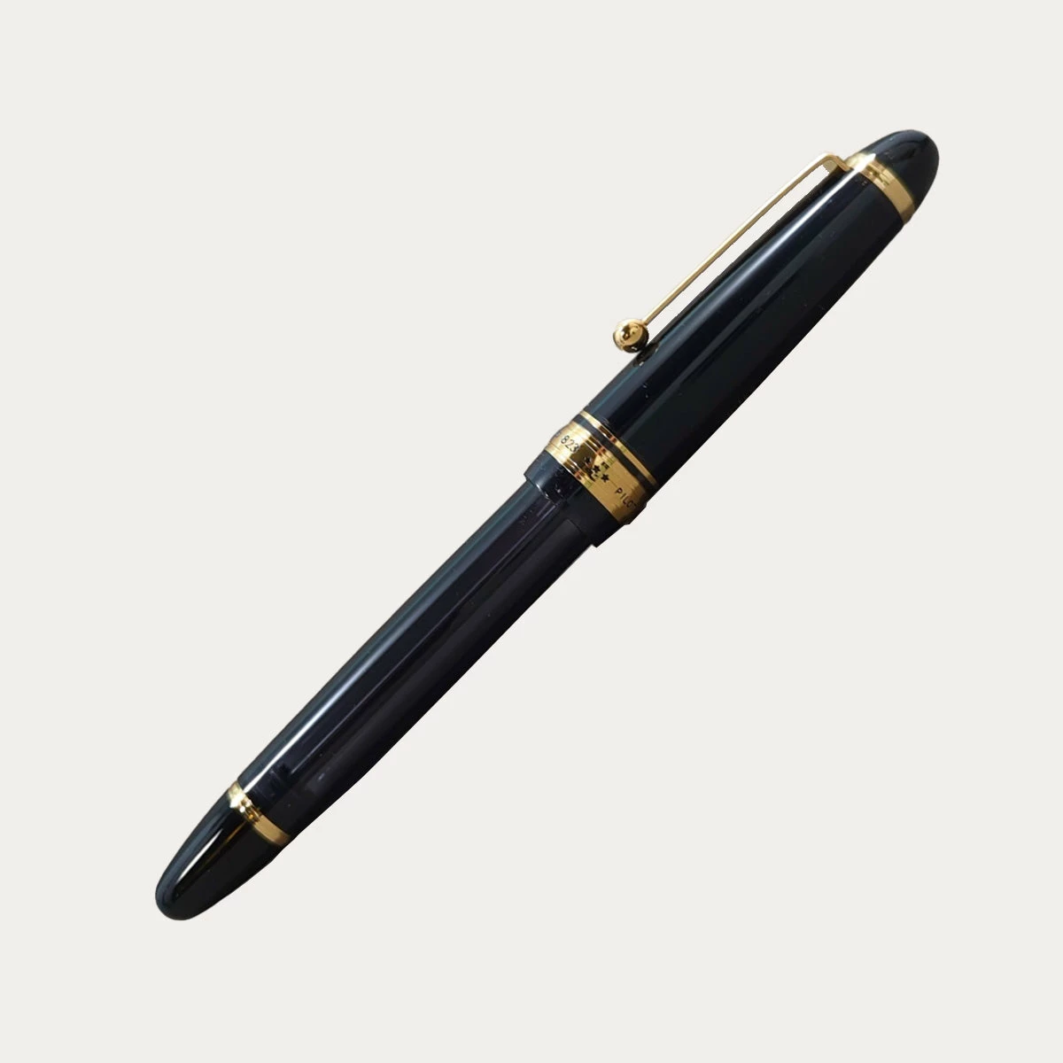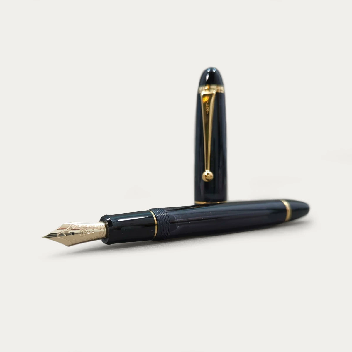 The Custom 823 has a classic cigar shape with gentle curves, echoed in the ball-shaped end of the metal clip, while the translucent body gives it a more modern feel. It has a resin body with a screw-on cap that can be posted and a large 14k gold nib. The pen comes in a gift set with a bottle of blue Pilot ink.