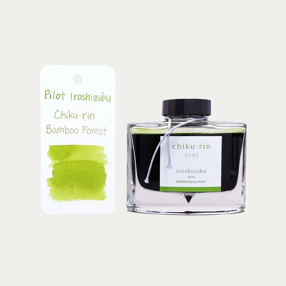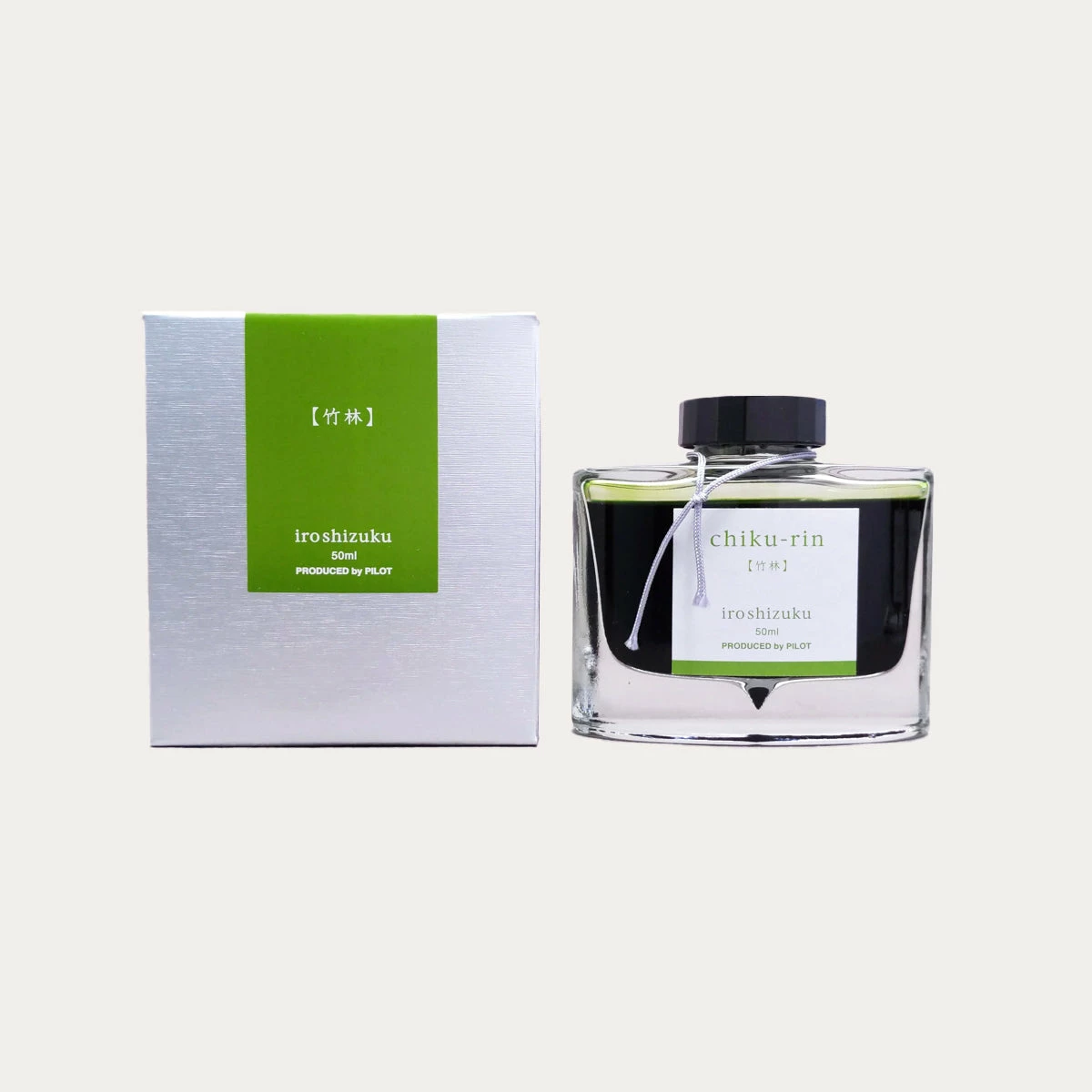 Iroshizuku inks are high-quality, dependable inks in gorgeous colors that reflect the natural scenery of Japan. “Iroshizuku” means “color droplets,” and each ink color is inspired by some element of nature in the Japanese landscape. They look gemlike in their wide glass bottles, designed with a clever dip at the bottom so you can access the very last drops of ink inside. Chiku-rin is a leafy yellow-green.