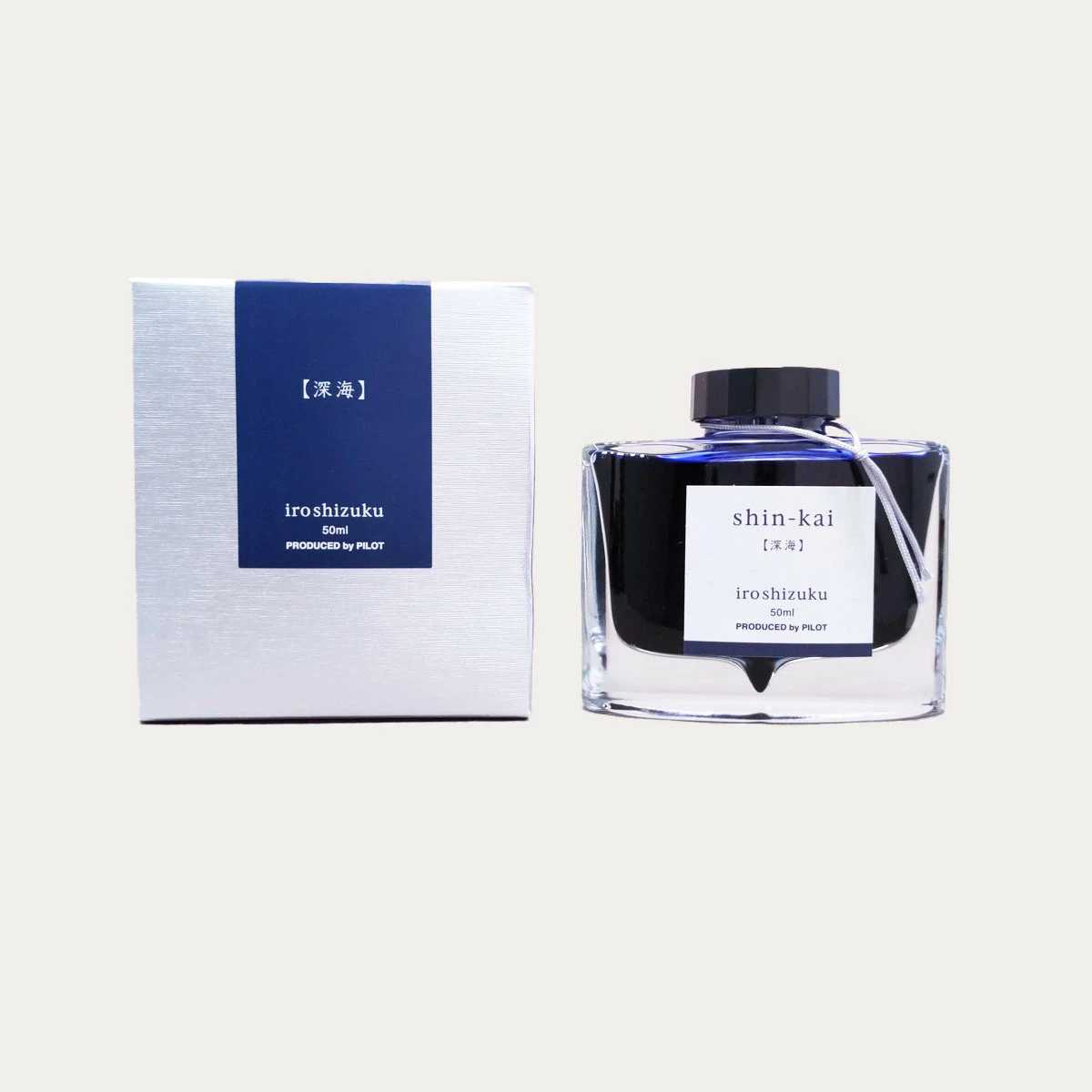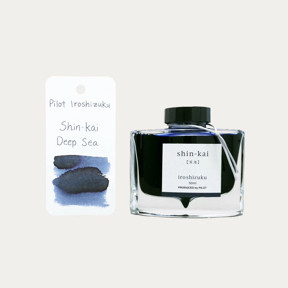Iroshizuku inks are high-quality, dependable inks in gorgeous colors that reflect the natural scenery of Japan. “Iroshizuku” means “color droplets,” and each ink color is inspired by some element of nature in the Japanese landscape. They look gemlike in their wide glass bottles, designed with a clever dip at the bottom so you can access the very last drops of ink inside. Shin-kai is a rich blue-black ink.