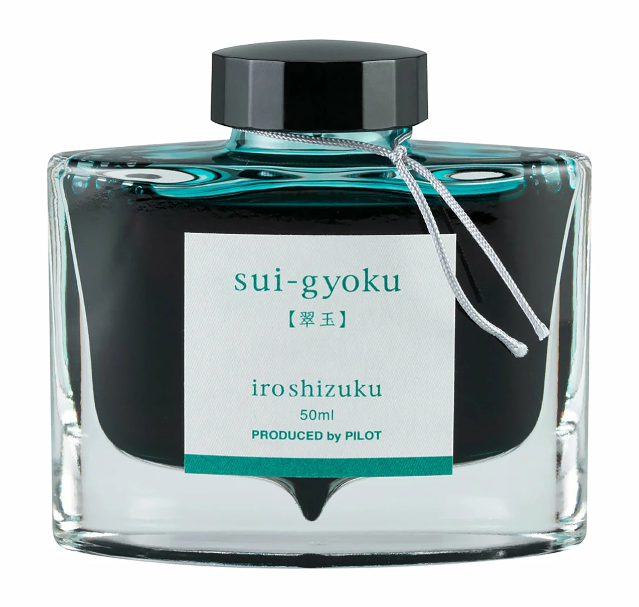 Iroshizuku inks are high-quality, dependable inks in gorgeous colors that reflect the natural scenery of Japan. “Iroshizuku” means “color droplets,” and each ink color is inspired by some element of nature in the Japanese landscape. They look gemlike in their wide glass bottles, designed with a clever dip at the bottom so you can access the very last drops of ink inside. Sui-gyoku is a beautiful teal ink.