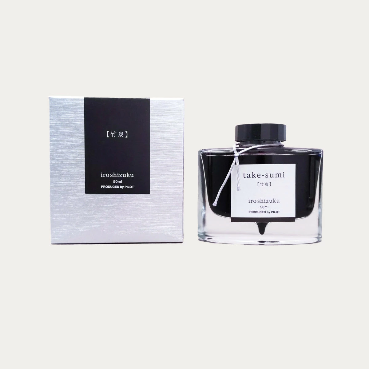Iroshizuku inks are high-quality, dependable inks in gorgeous colors that reflect the natural scenery of Japan. “Iroshizuku” means “color droplets,” and each ink color is inspired by some element of nature in the Japanese landscape. They look gemlike in their wide glass bottles, designed with a clever dip at the bottom so you can access the very last drops of ink inside. Take-sumi is a rich charcoal black.