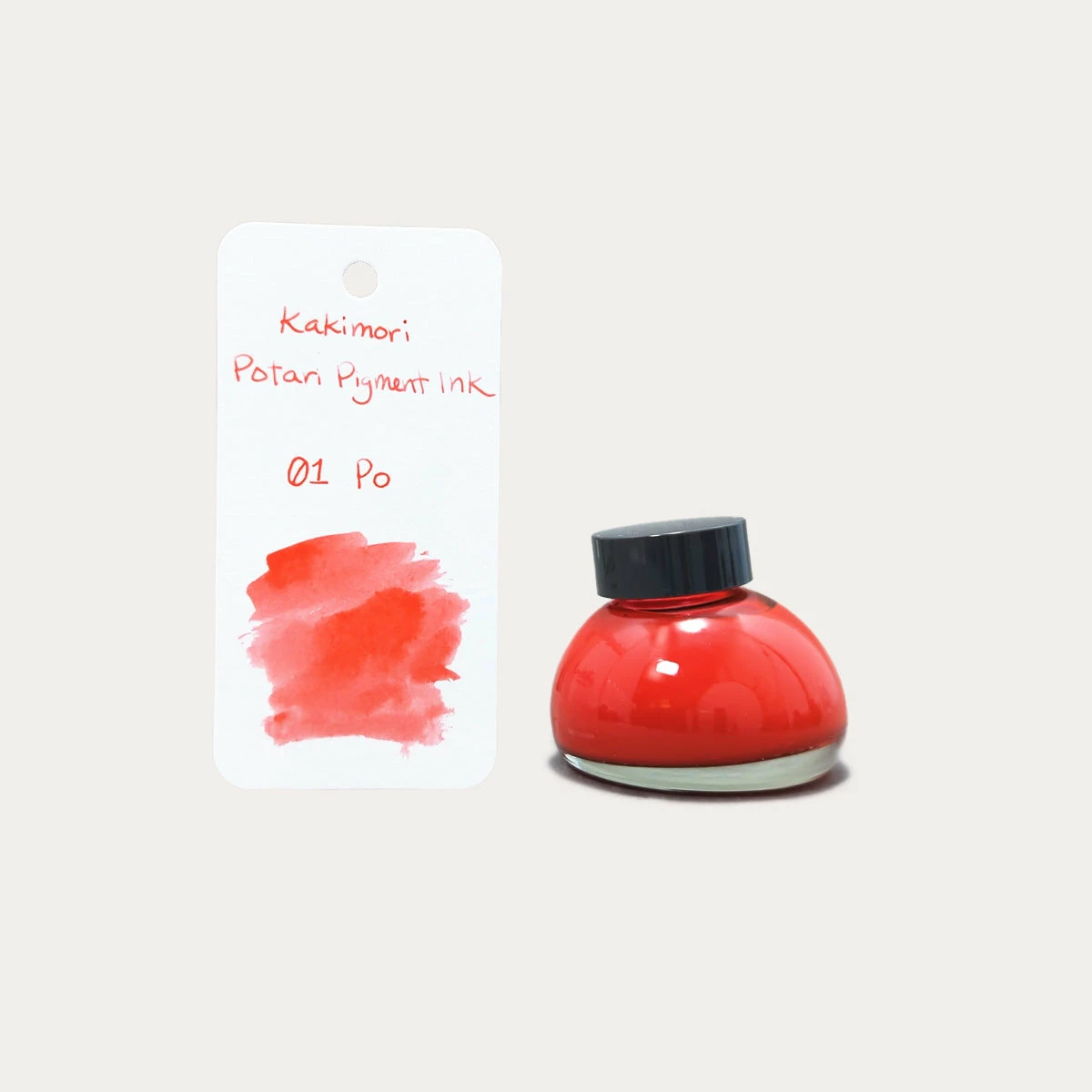 Kakimori’s Potari inks are richly colored pigment inks inspired by Japanese onomatopoeia and wordplay. Each color is associated with a familiar sound or feeling. Po is a soft blushing red. Kakimori describes it as “a color tucked away in our hearts. Po is the way we blush when falling in love; the warmth of a face admired from afar.”