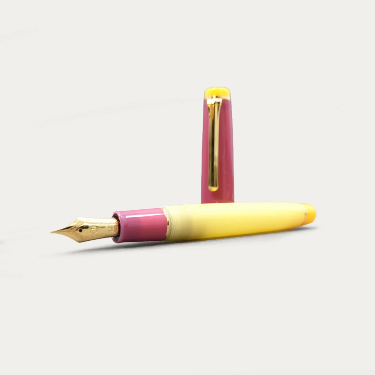 The Cyclamen pen is part of Sailor’s 2023 limited edition Cocktail series, a set of five gorgeous, colorful pens inspired by tequila-based cocktails. Cyclamen has a glowy lemon-juice yellow barrel with a grenadine-pink cap and grip and brighter lemon-peel end caps, accented with gold-plated trim.