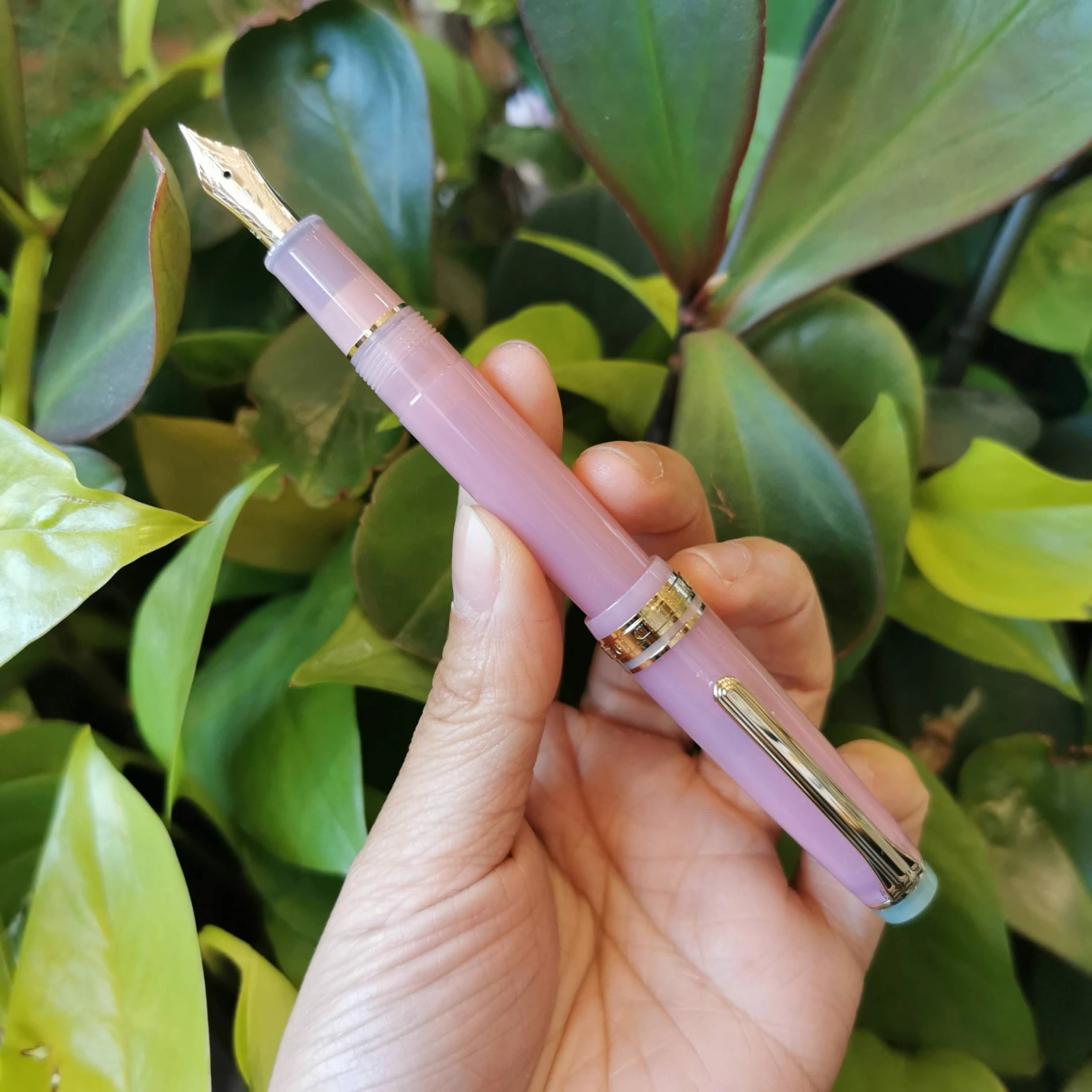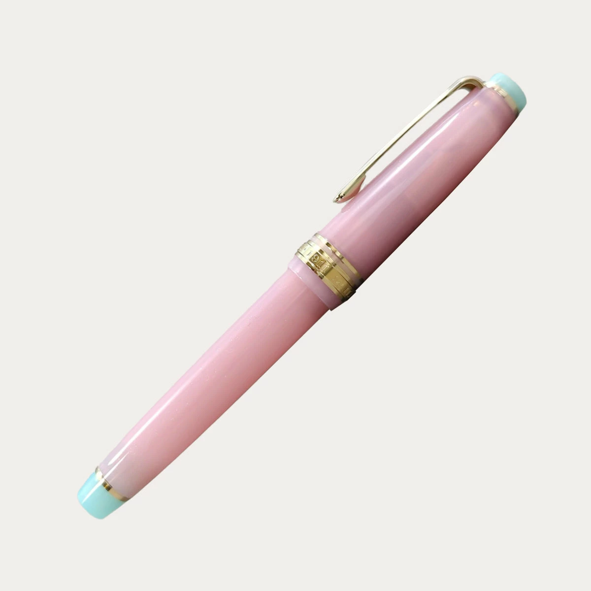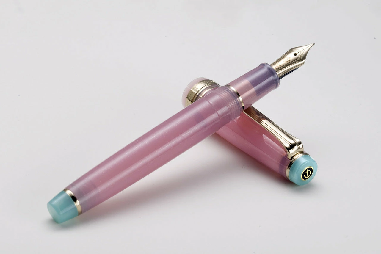 The Hagi pen is part of Sailor’s limited edition Solar Term series, a set of four gorgeous pens celebrating the solstices and equinoxes and inspired by Japanese seasonal traditions. Hagi represents the autumnal equinox and is named for bush clover, a flowering plant that’s a symbol of autumn in Japan. It’s a soft pink color with a purple grip and sea green finials, accented with gold trim.