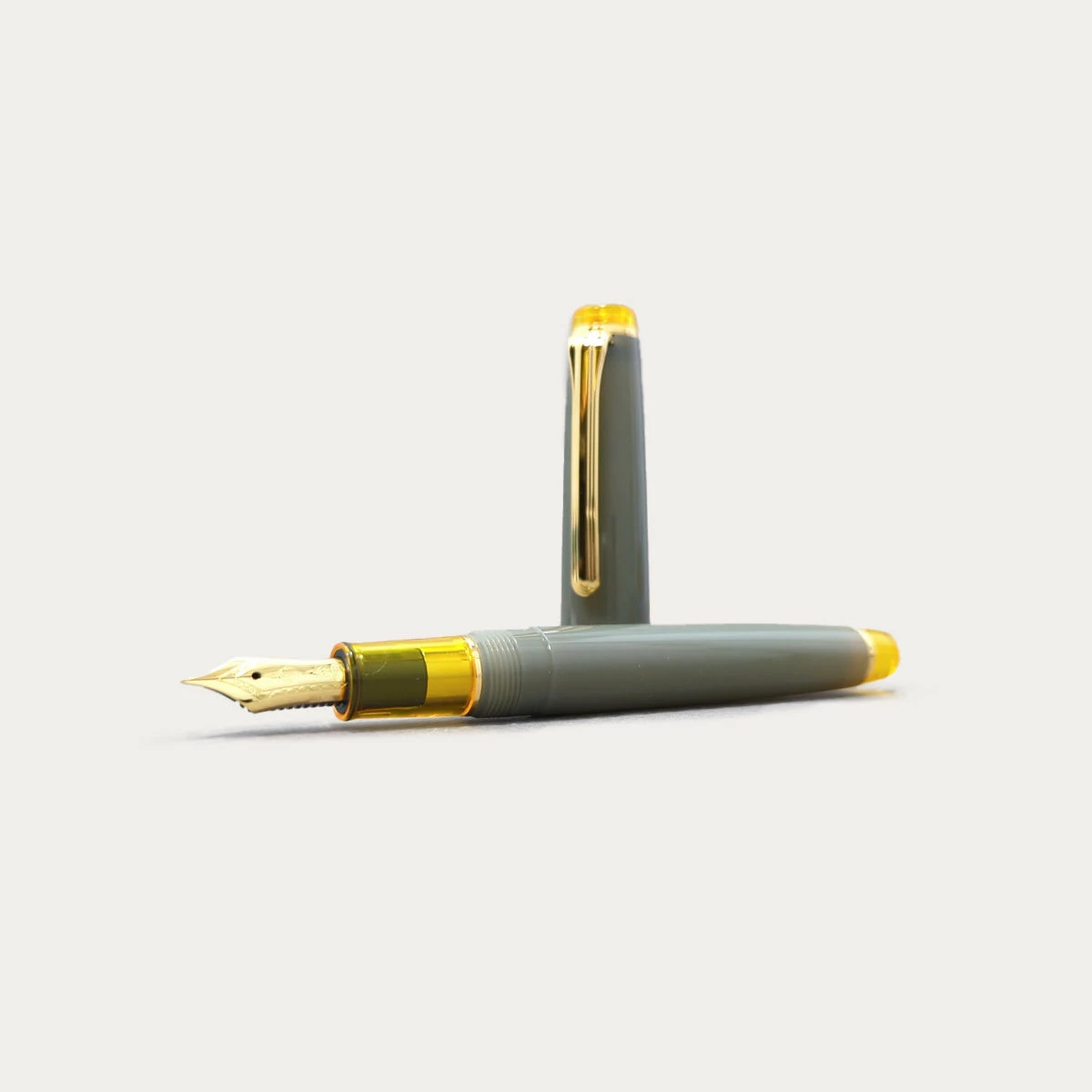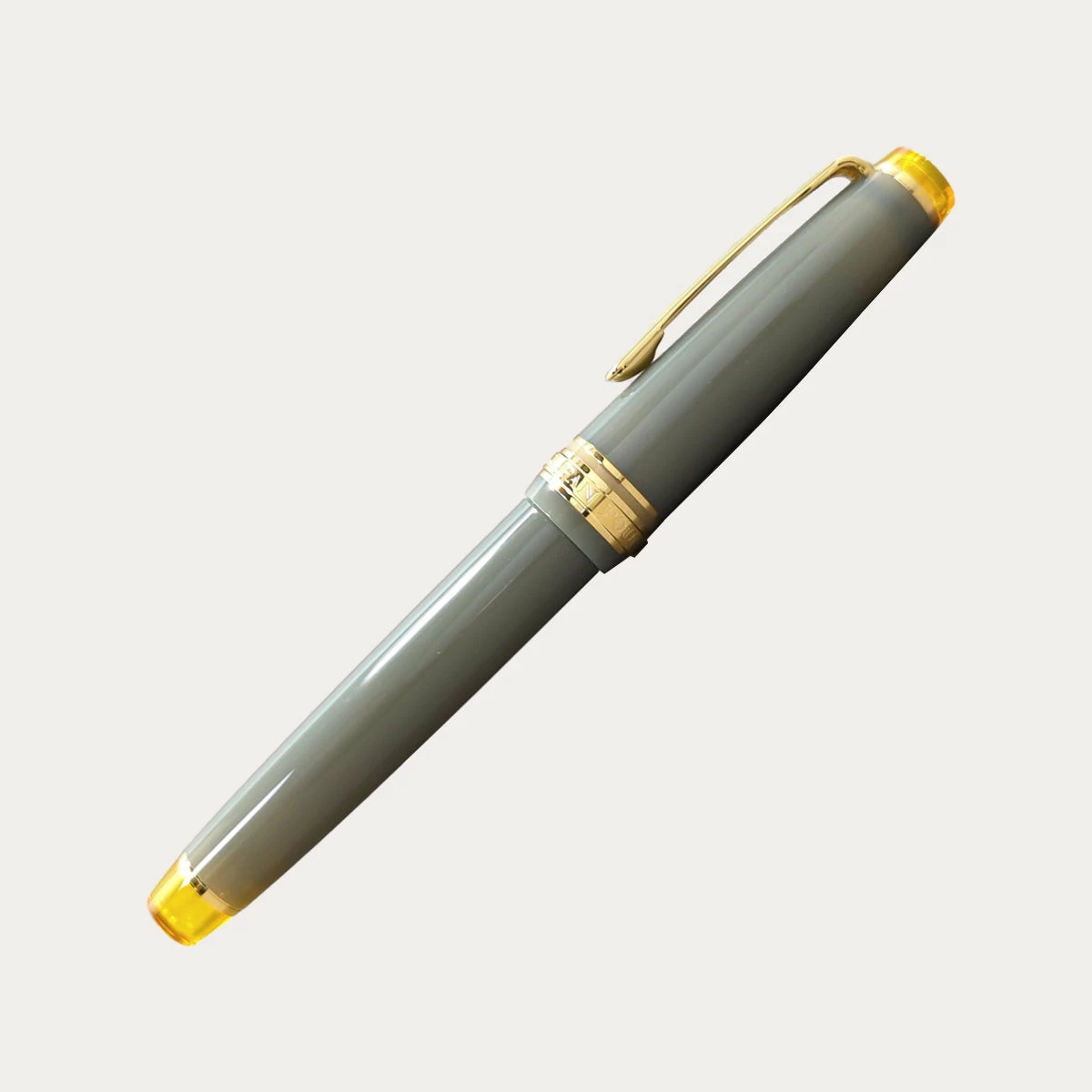 The Nuts pen is a warm gray-brown color with golden-yellow finials, inspired by their nut brown Manyo Shirakashi ink and yellow Manyo Yamabuki ink. It has gold trim, and the cap features a golden acorn finial in place of Sailor’s silver anchor. This pen has a 14k gold nib and comes with a bottle of Sailor’s Manyo Shirakashi ink.