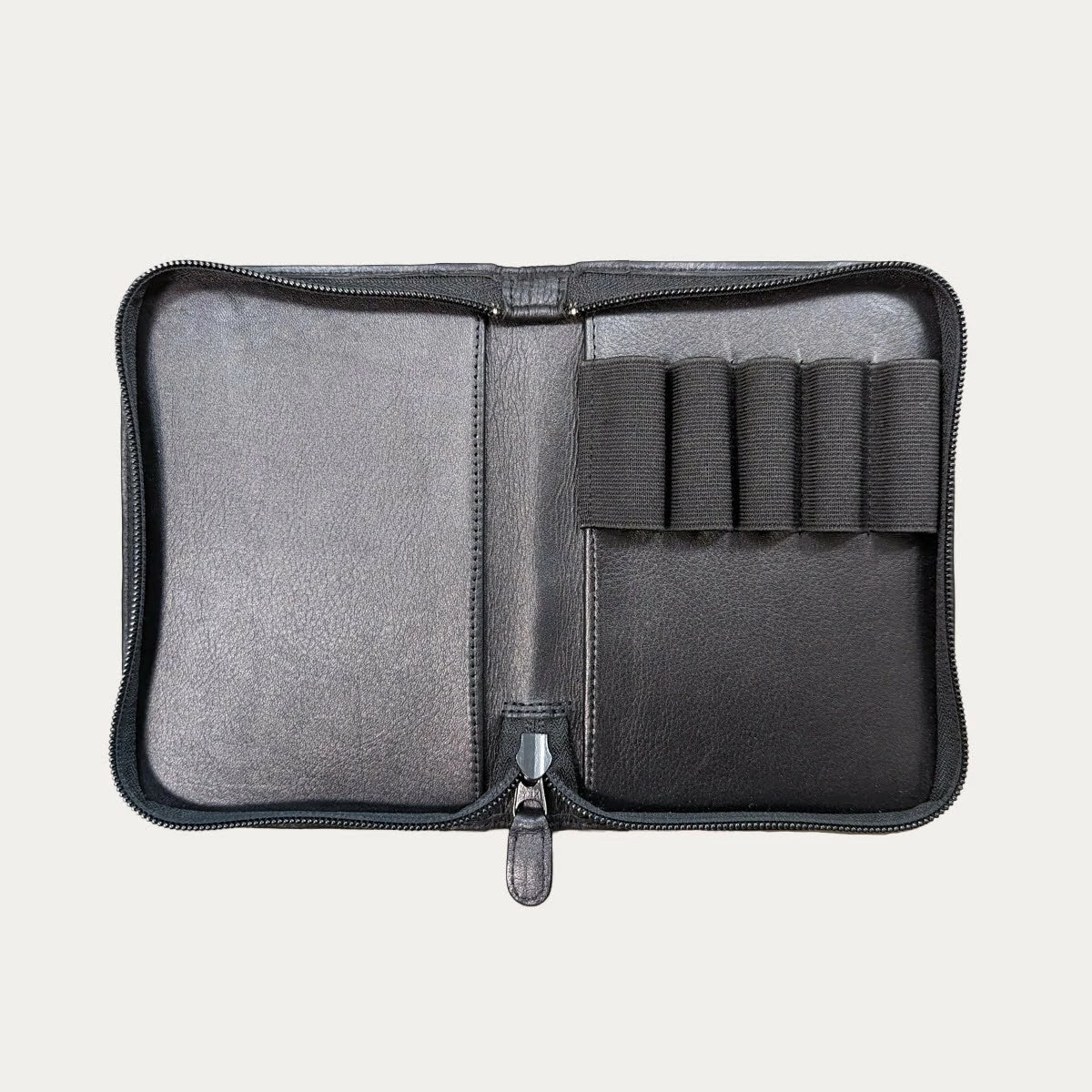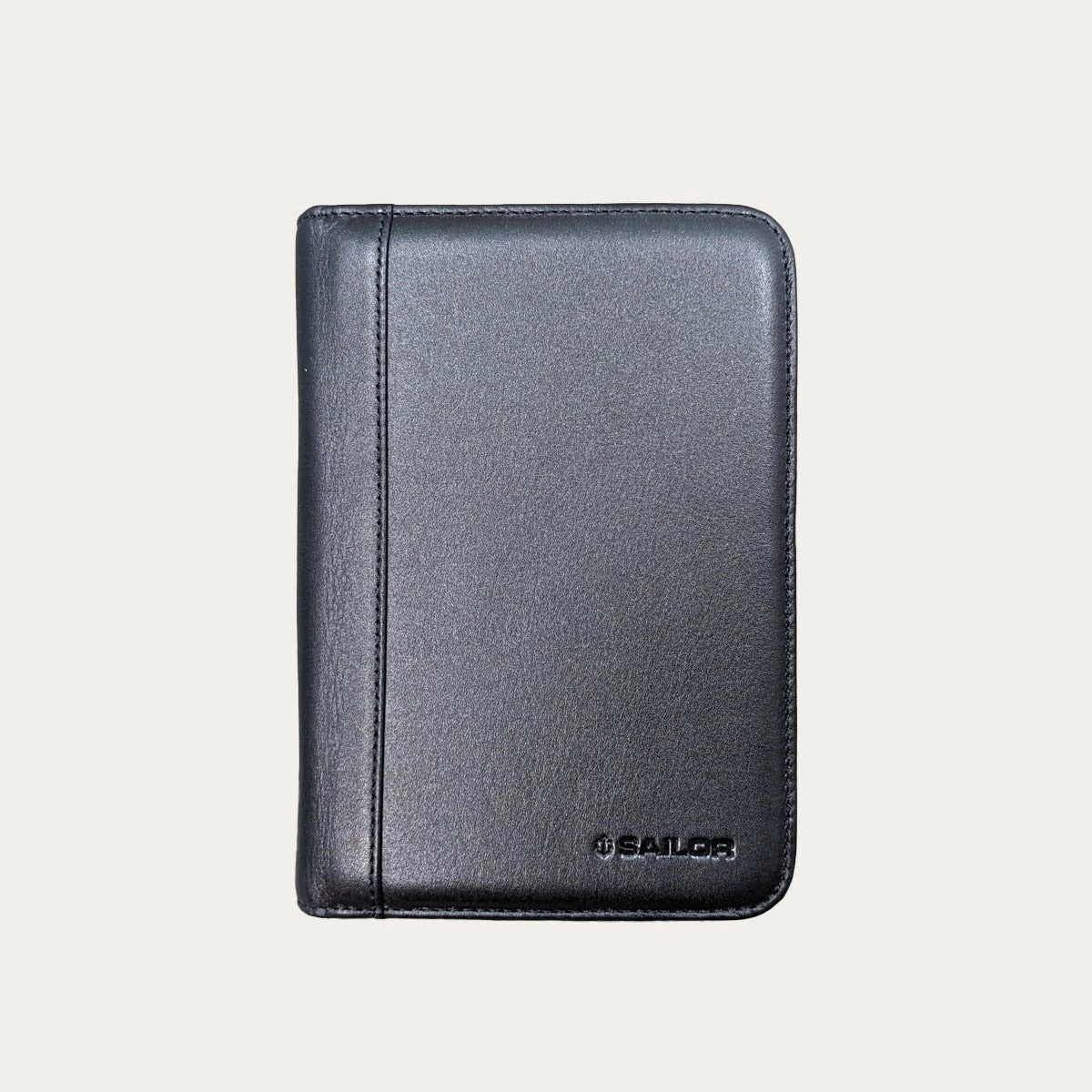 This black leather zippered pen case has large elastic loops and holds up to five pens. The Sailor logo is embossed on the front corner of the case.