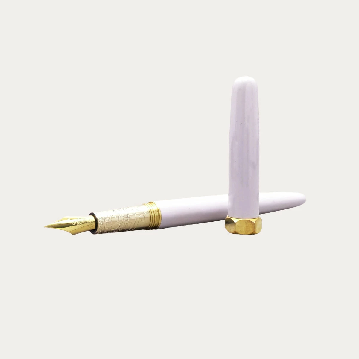 Ferris Wheel Press’s Brush Fountain Pen is shaped like a classic paintbrush, with a smooth tapered body that’s well balanced and comfortable to hold. The body is copper with bright brass accents and a gold-plated stainless steel nib. The grip is engraved with fanning geometric lines that call to mind vintage mechanical components, from the printmaking equipment Ferris Wheel Press uses to the ferris wheel that is their namesake.