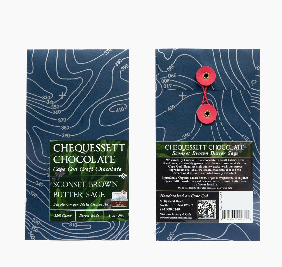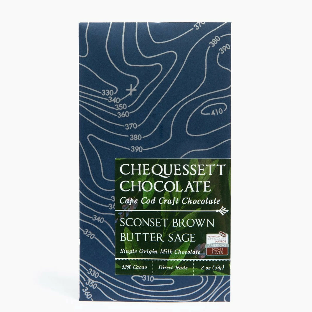 Chequessett Chocolate is a chocolatier based on Cape Cod, MA. They craft mouthwatering chocolate in small batches, working directly with cacao bean producers to make sure their supply chain is ethical and environmentally sound. The high quality cacao beans make delicious chocolate! Sconset Brown Butter Sage is a milk chocolate bar with the nutty caramel flavor of browned butter and bright notes of sage.