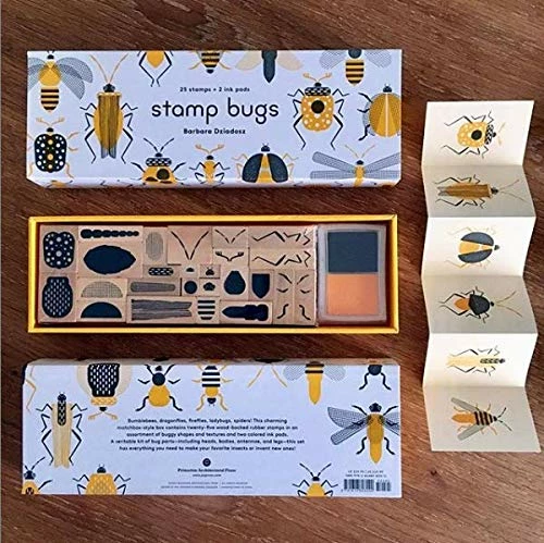 Glory in the world of insects with this mix-and-match stamp set! Each box contains 25 wood-backed stamps in every shape you need to create your own specimens: heads, bodies, wings, legs, and antennae in a variety of shapes and sizes and textures. The set includes 2 ink pads to stamp with. It’s great for decorating cards, letters, journals, and stationery of every kind.