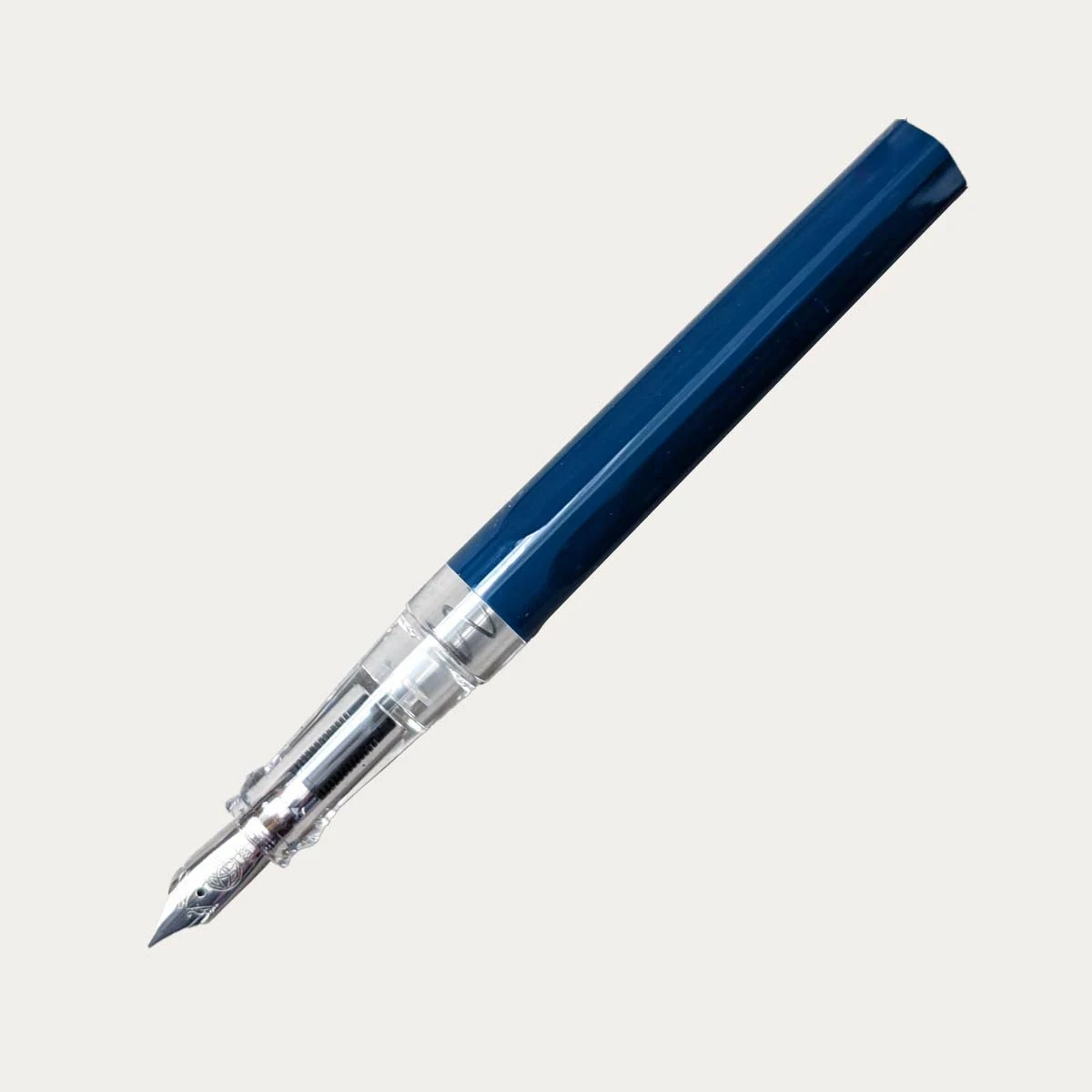 The pen barrel is a solid blue color with a transparent grip so you can see your ink level. The pen body is plastic with a metal clip. The stainless steel nib is available in multiple sizes.
