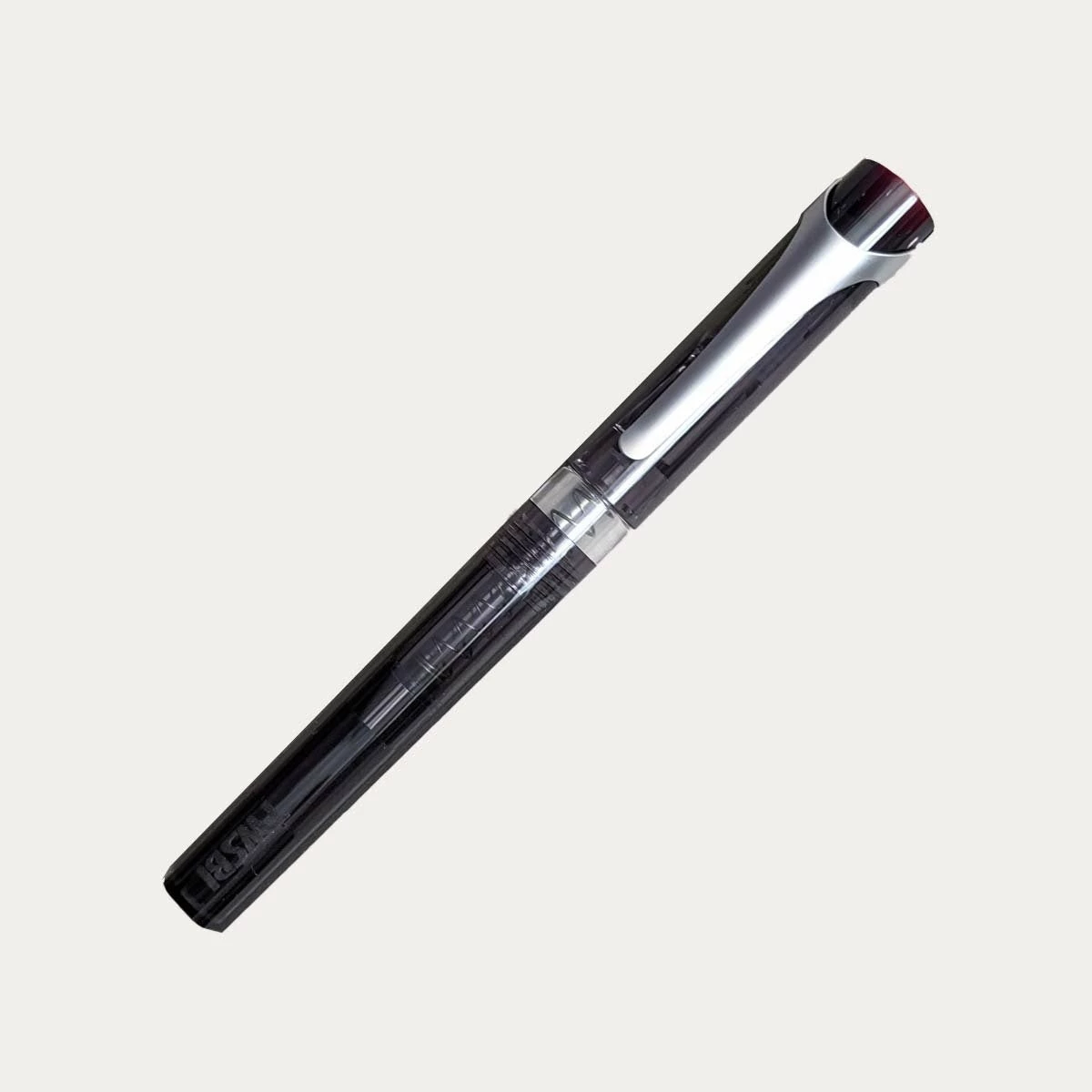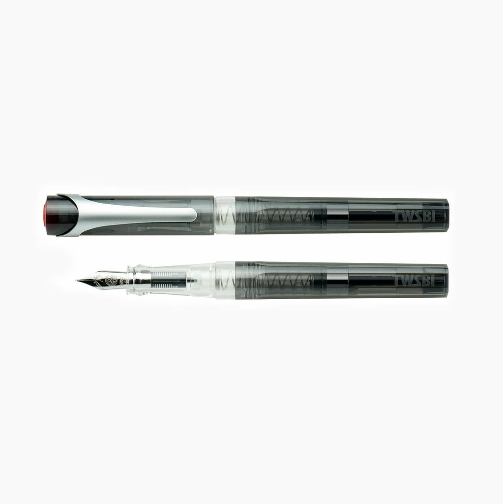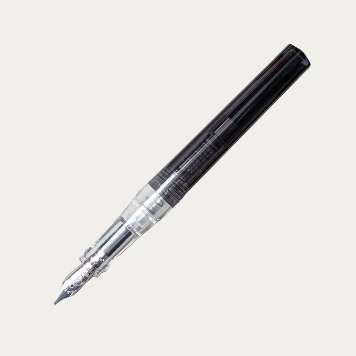 The pen barrel is a translucent smoky gray color with a transparent grip so you can see your ink level. The pen body is plastic with a metal clip. The stainless steel nib is available in multiple sizes.