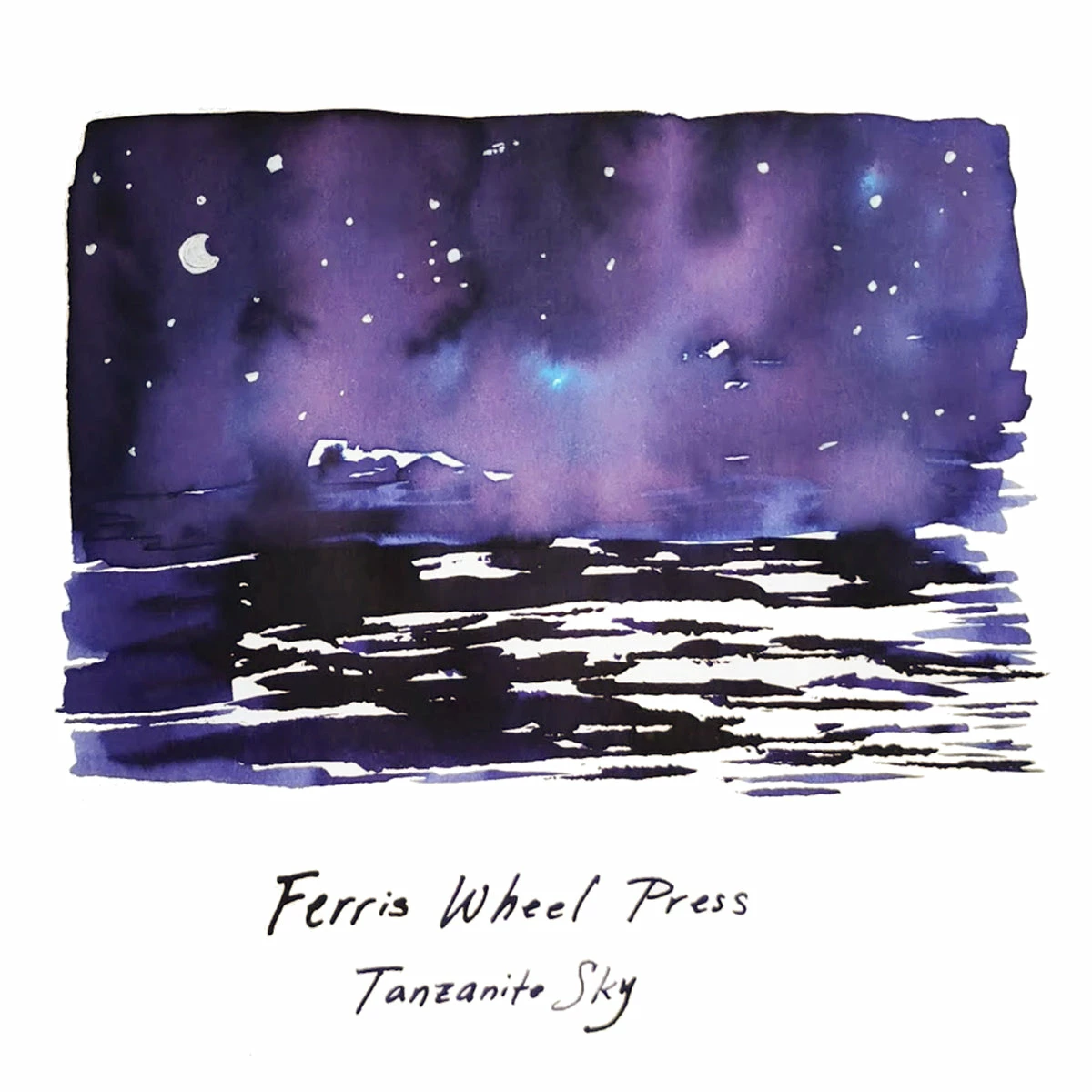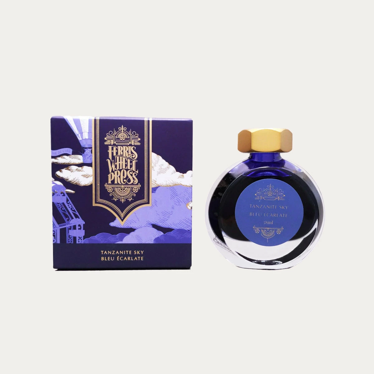 Like all their products, Ferris Wheel Press’s bottled inks are objects of beauty as well as functional tools. Their inks come in round glass bottles with hexagonal brass caps, in a range of rich, gemlike colors. Their Tanzanite Sky is a deep velvety blue color.