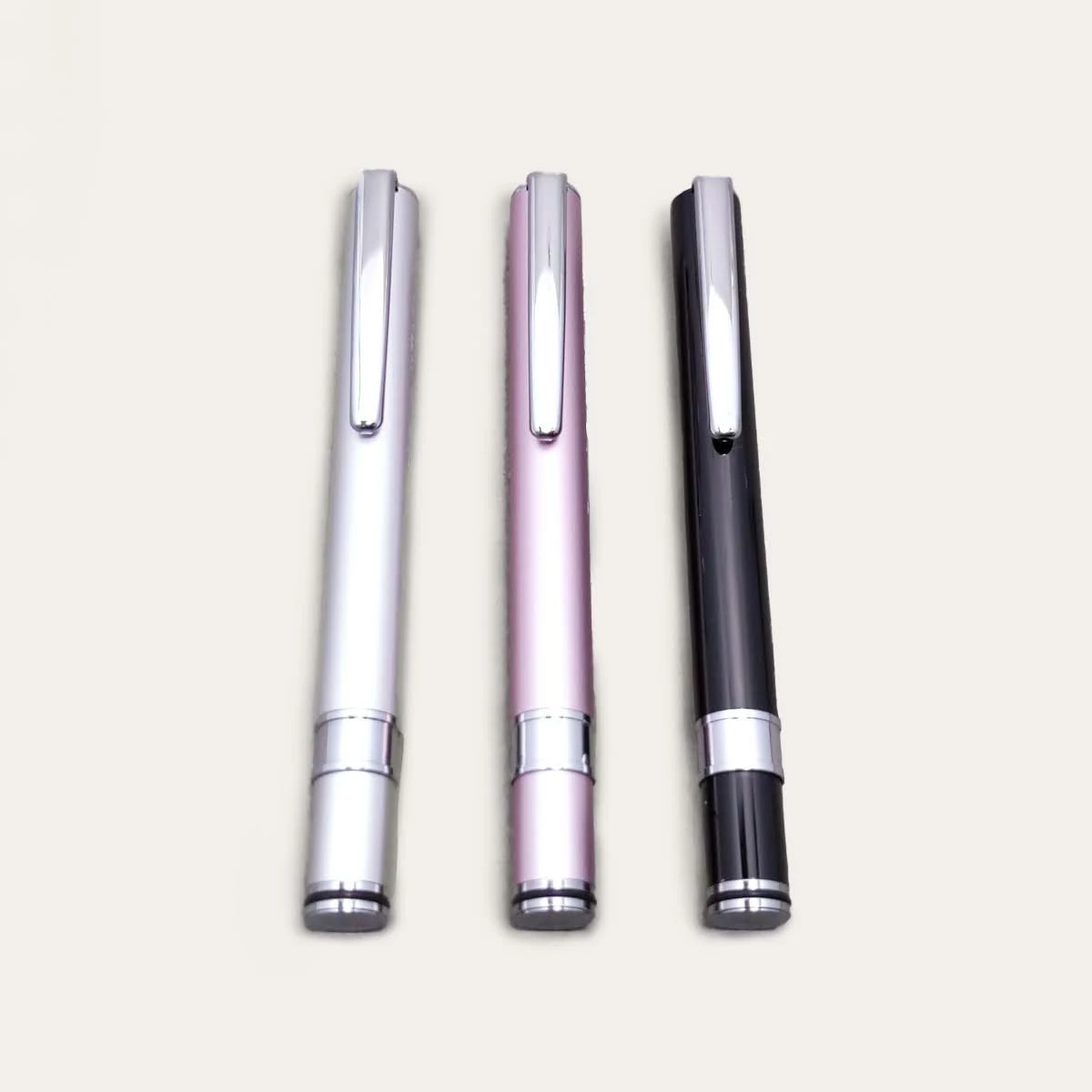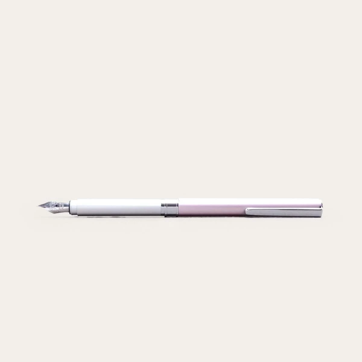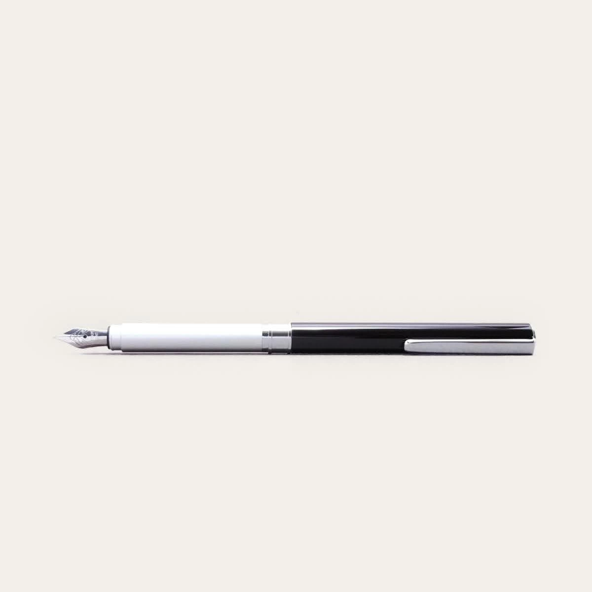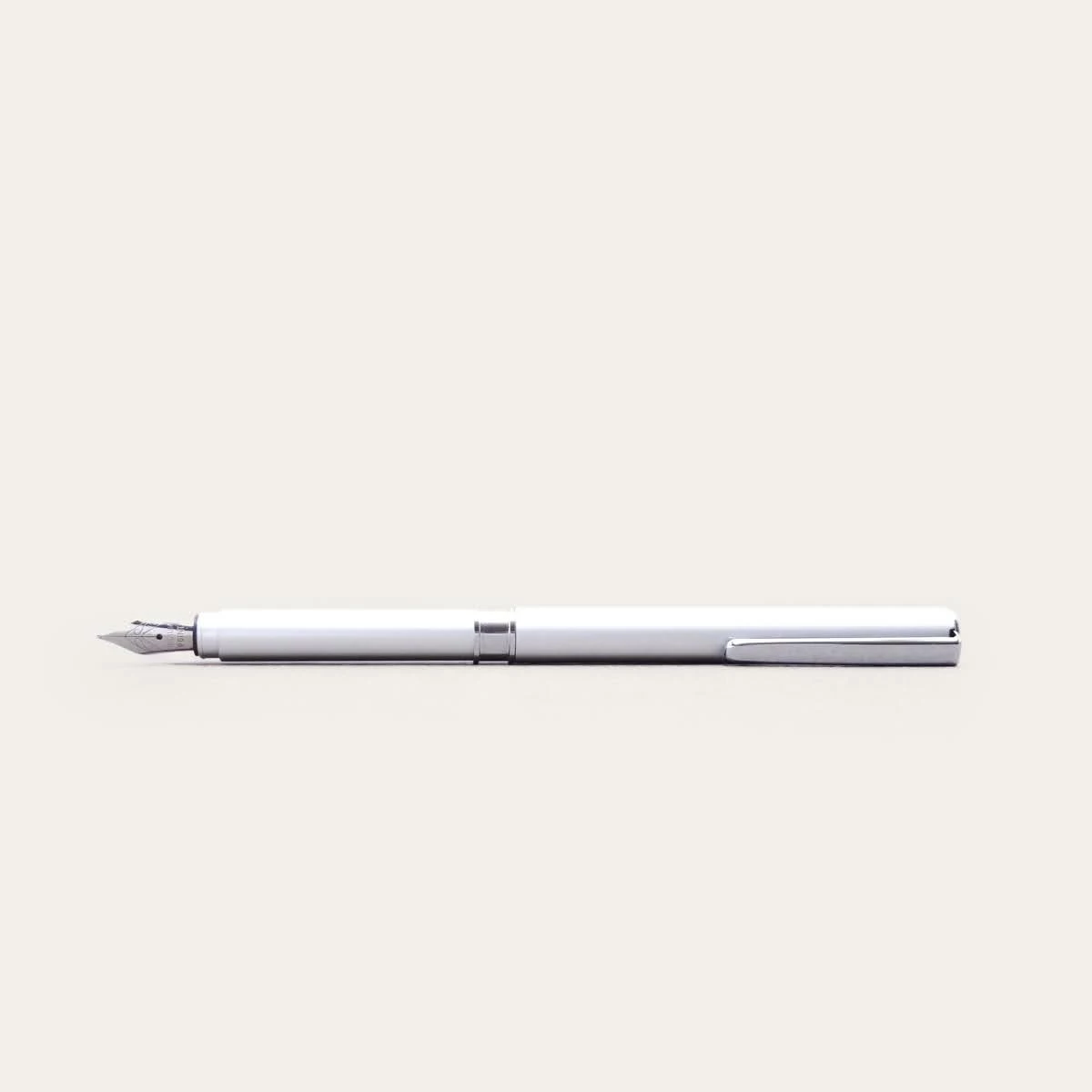 The Ohto Tasche Fountain Pen is a compact, pocket-sized pen whose cap snaps onto the end to extend to a full length for writing. It’s a slim pen with an aluminum body and a built-in clip. It has a fine, stainless steel nib and fits standard international short cartridges only.
