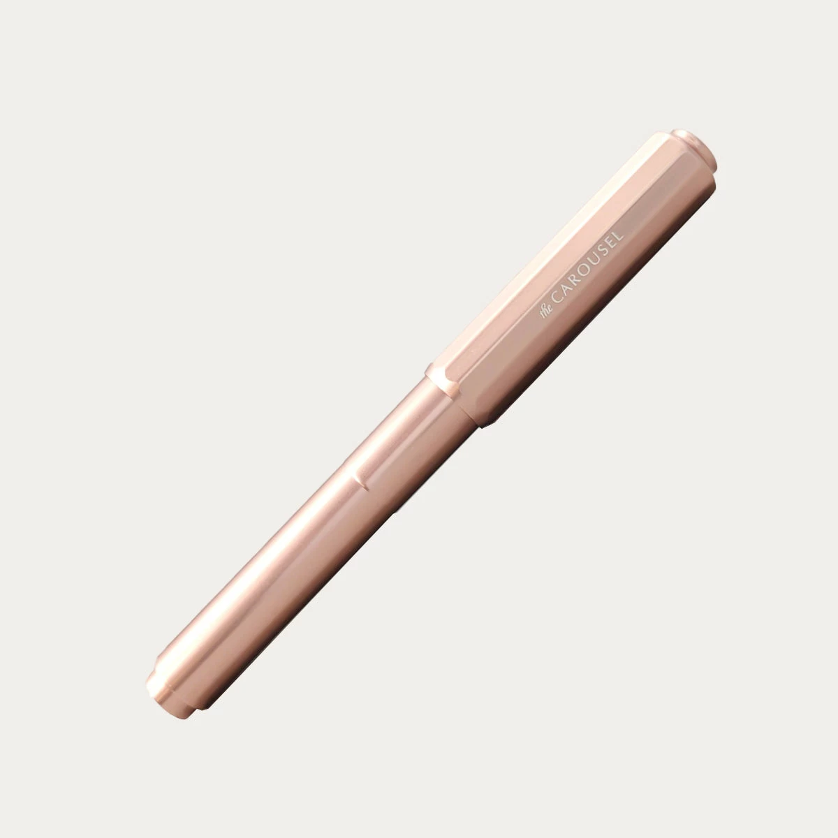 The Carousel Fountain Pen is a substantial but lightweight pen with a rounded body and faceted cap and grip. It sports a custom ground steel nib with an engraving of a horse. The cap screws on and can be posted.