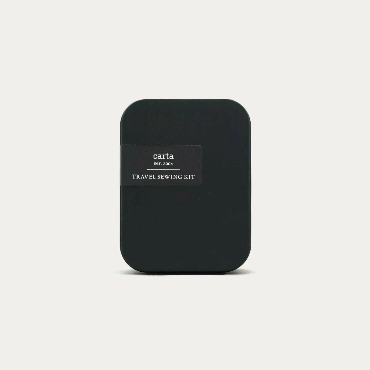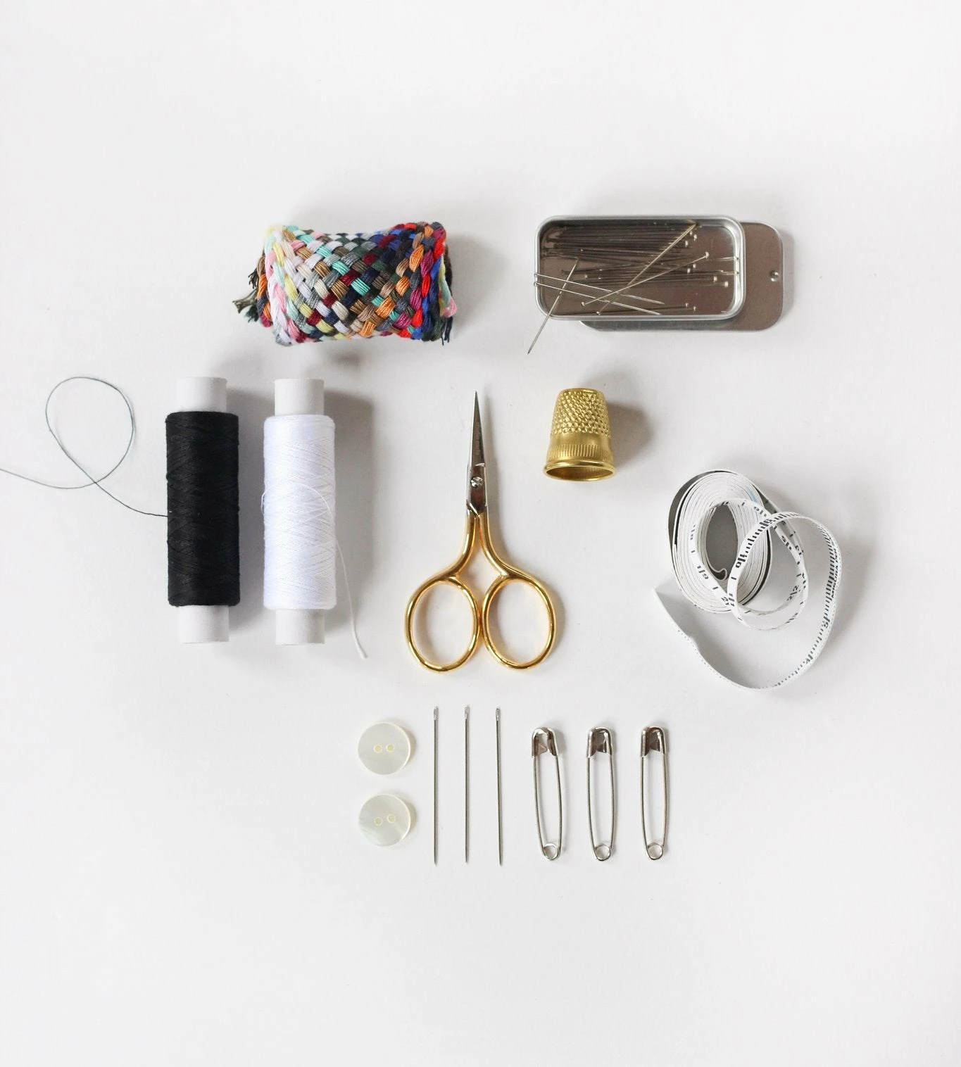 This petite travel sewing kit contains everything you need for mending and sewing on the go. The small tin box contains a pair of tiny thread scissors; a thimble, measuring tape, pins, needles, and buttons; spools of black and white thread, and a braided skein of thread in 25 different colors.